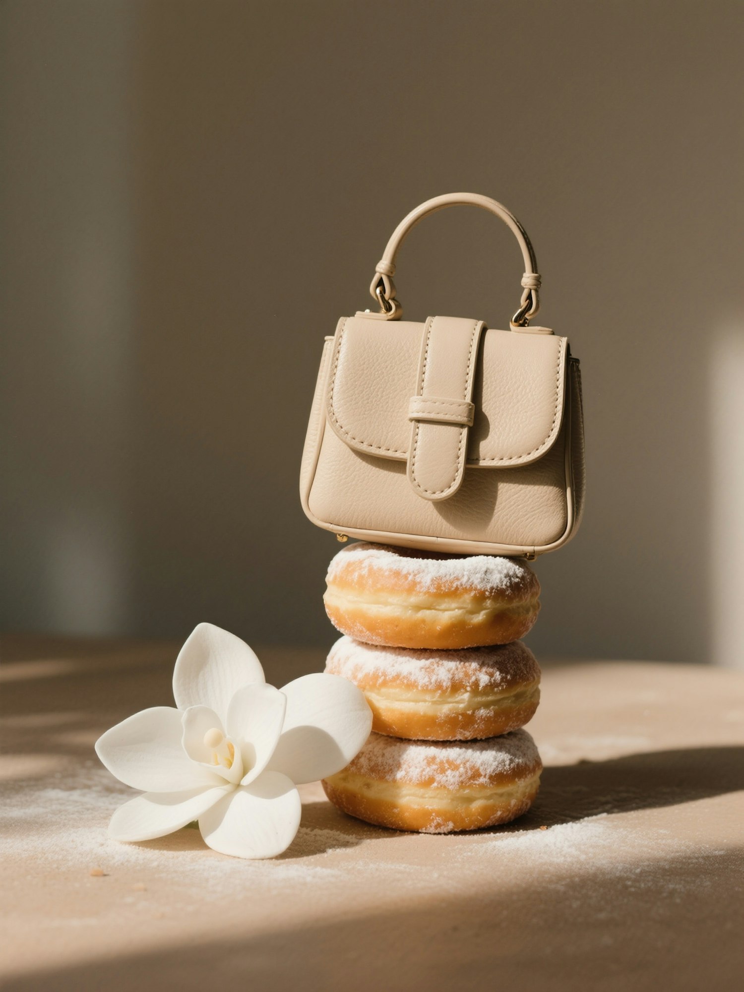 A beige mini bag balanced on powdered donuts, accented by an abstract white flower. Earthy tones, clean shadows, and soft spotlight lighting.