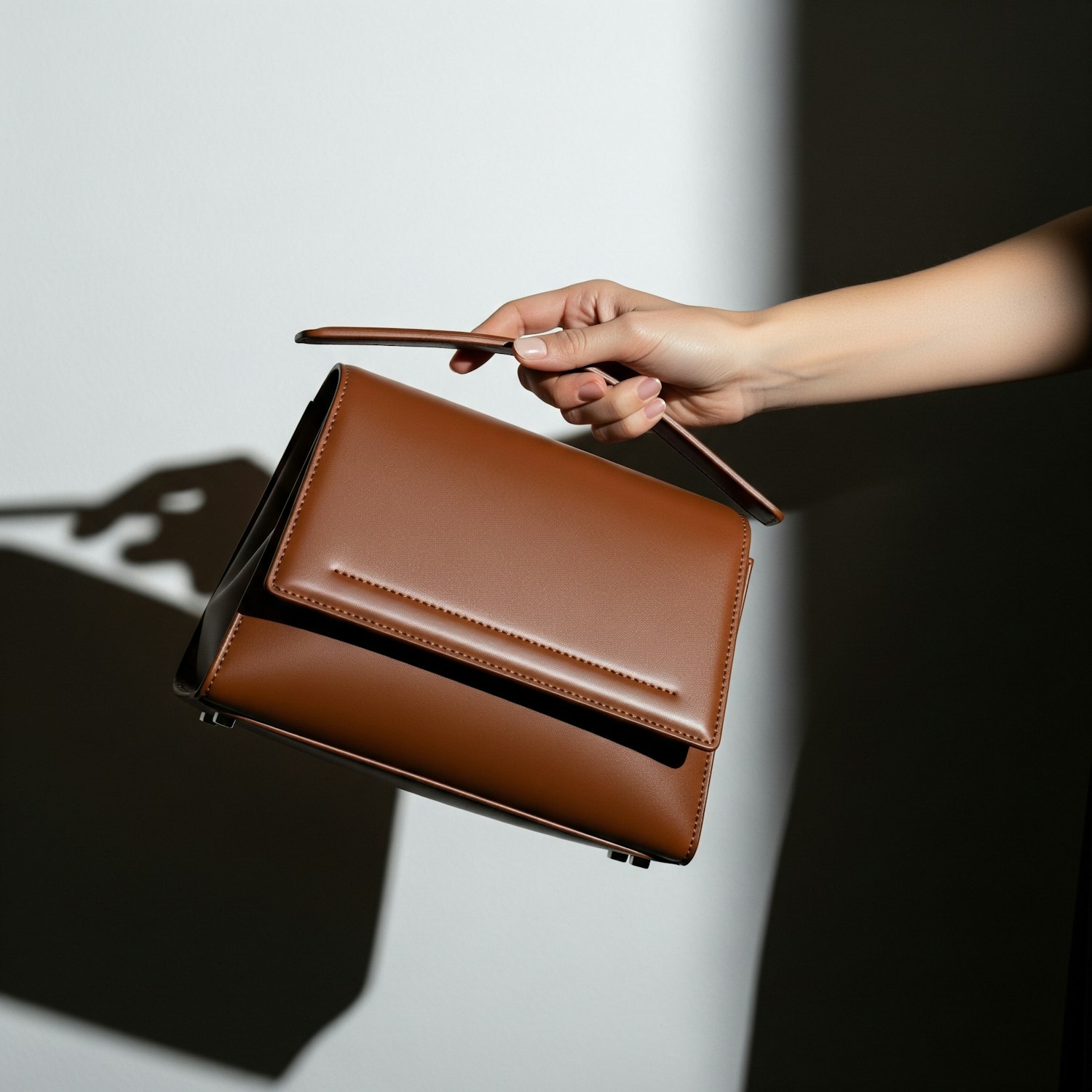 Minimalist brown leather handbag held by a hand, showcasing its sleek design and premium craftsmanship against a neutral background.
