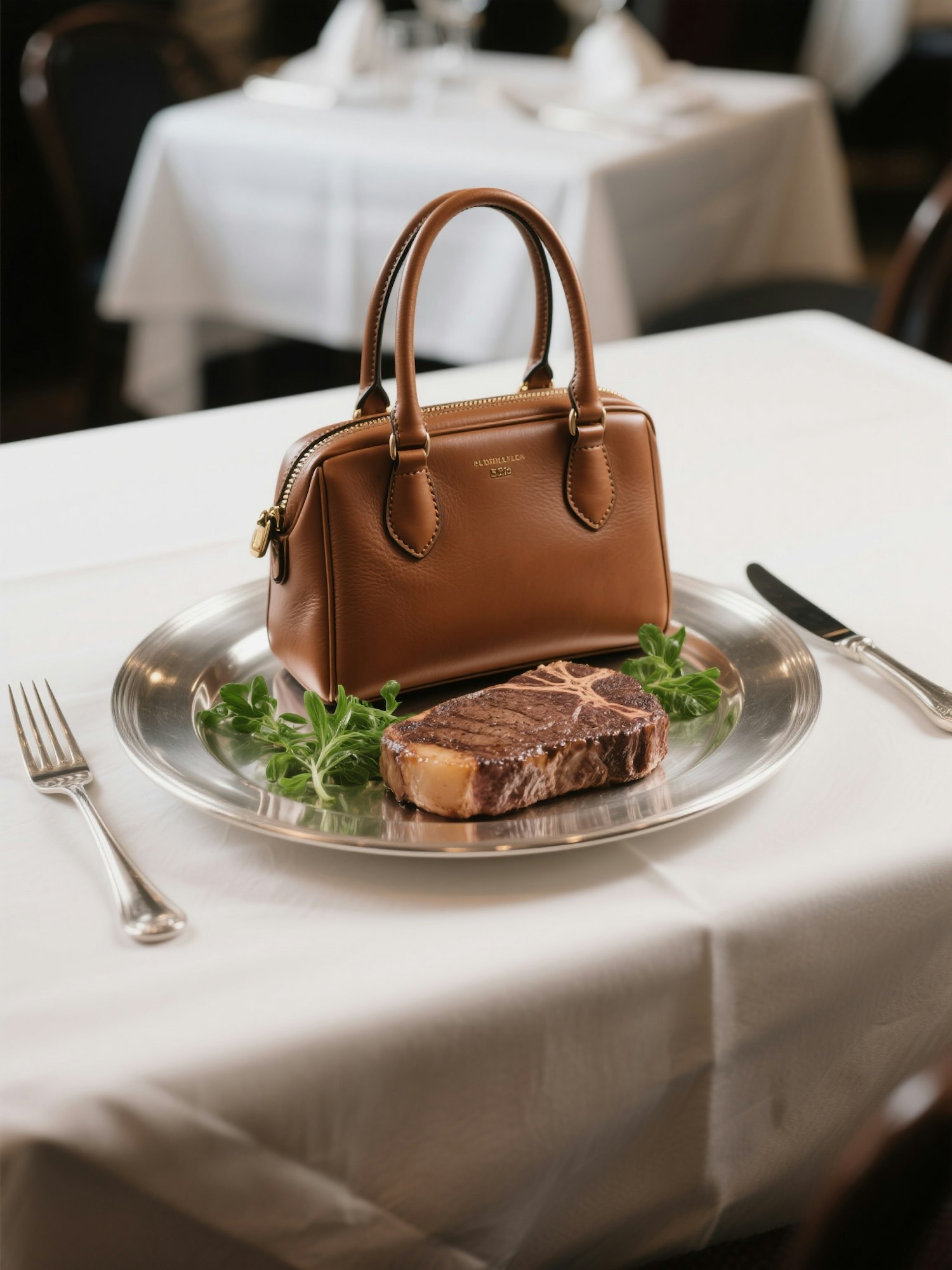 A stylish brown leather handbag displayed on a silver platter with a steak, set in an elegant restaurant setting.