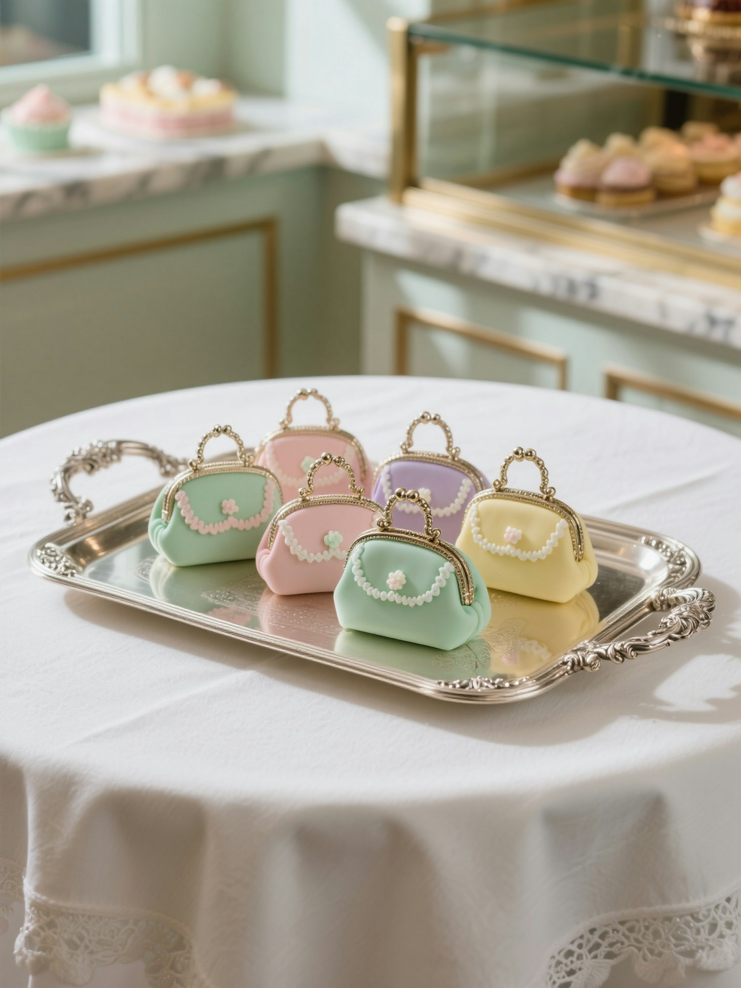 Elegant pastel handbag-shaped desserts on a silver tray, perfect for a chic tea party or bakery display.