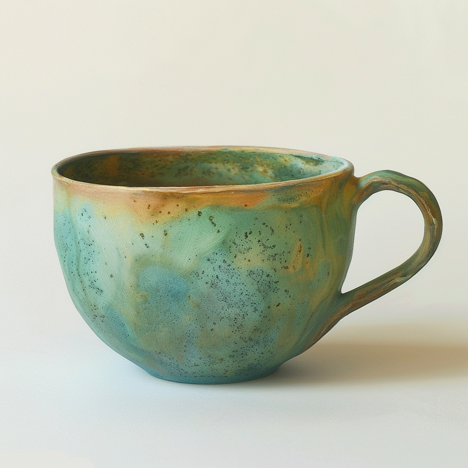 Handcrafted ceramic cup with earthy green and golden-brown glaze, speckled texture, and rustic artistic design on a plain background.
