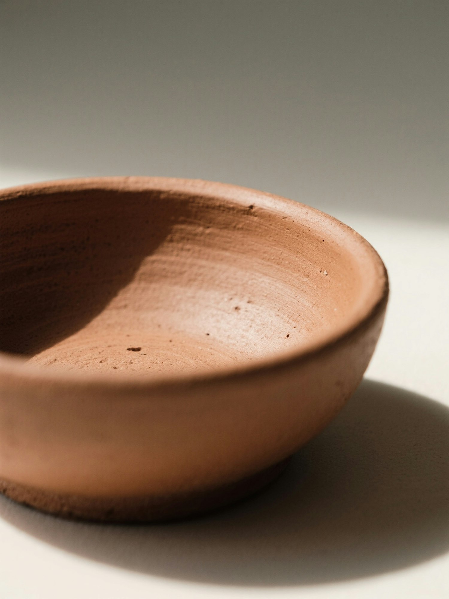 A close-up of a handcrafted clay bowl with earthy tones and natural textures, illuminated by soft light against a minimalistic background.