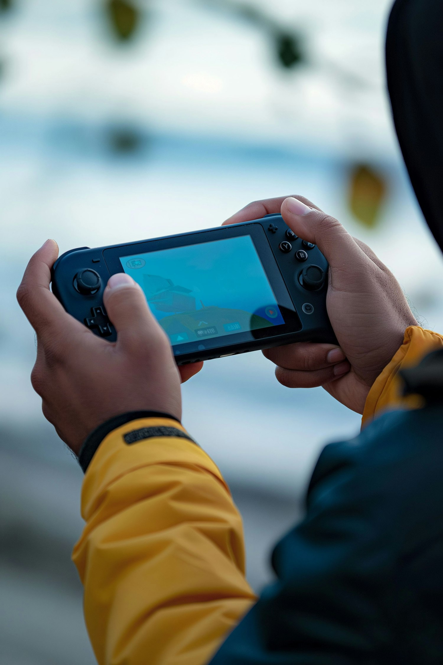 Person playing on a handheld gaming console outdoors, wearing a yellow jacket. Focus on hands and device, blurred background.