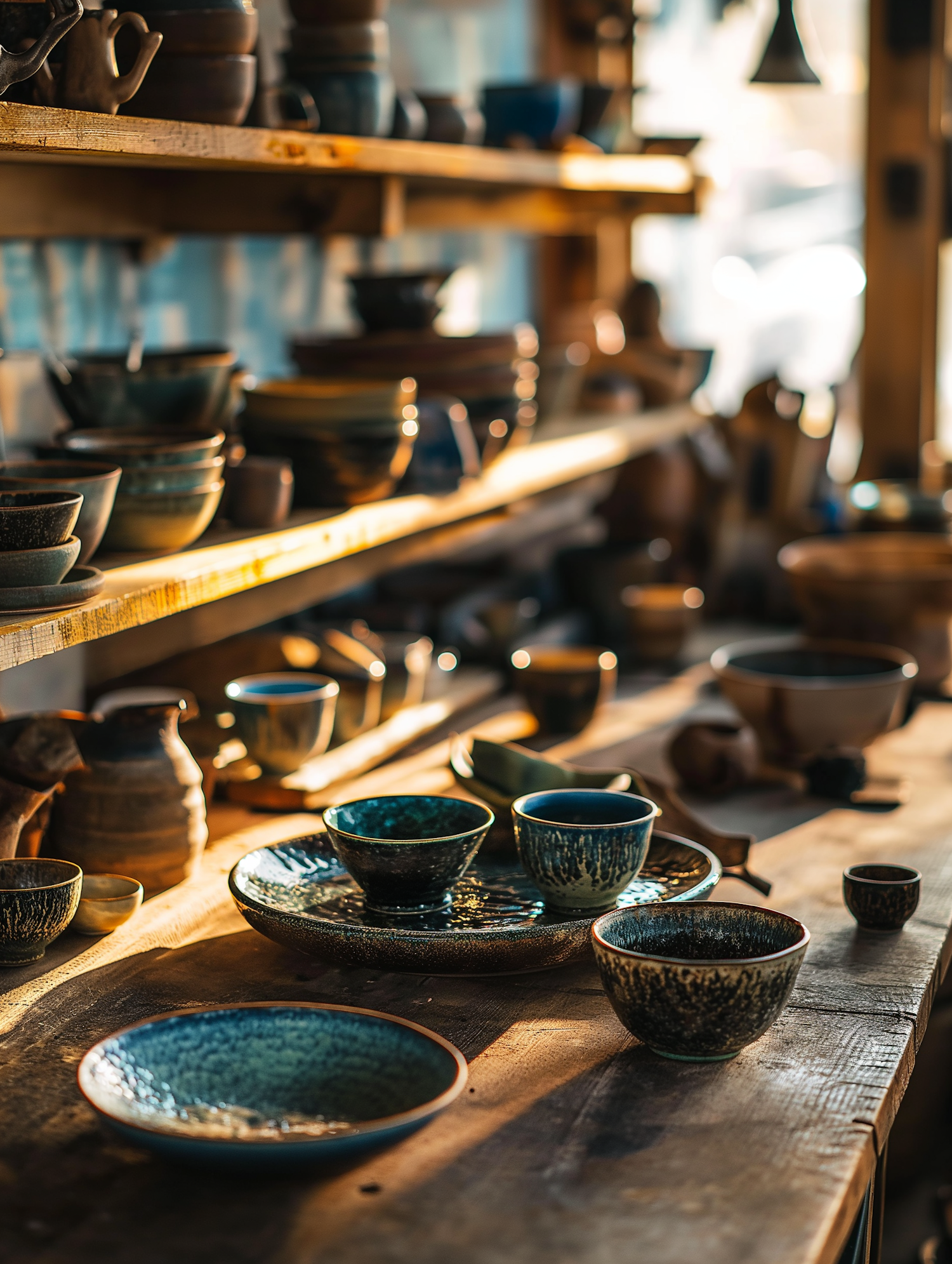 Warm sunlight illuminates a rustic pottery studio with handcrafted ceramic bowls and plates in earthy tones and blue glazes.