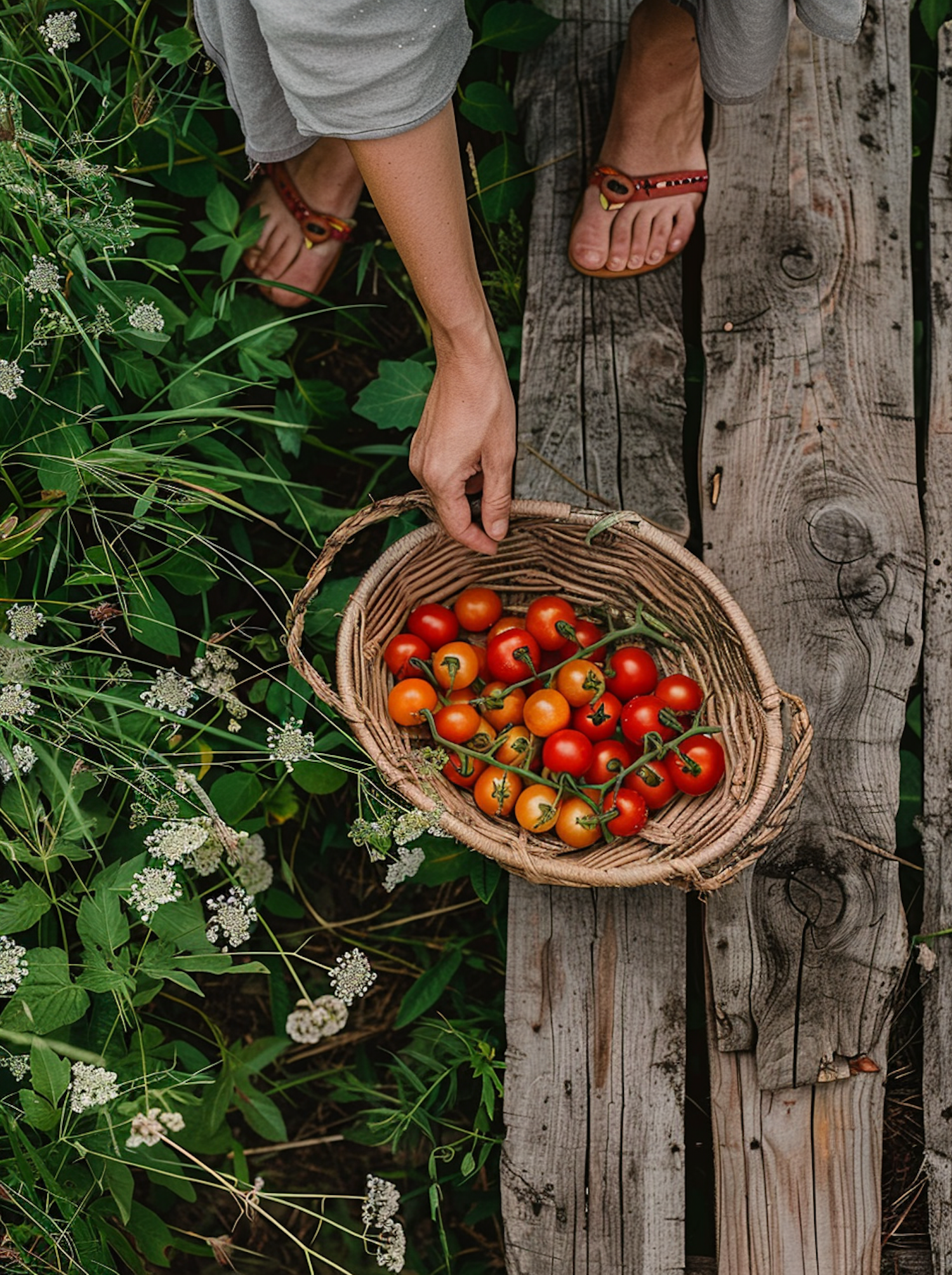 Top-down view of a basket filled with fresh cherry tomatoes, held by a person on a rustic wooden path surrounded by greenery.