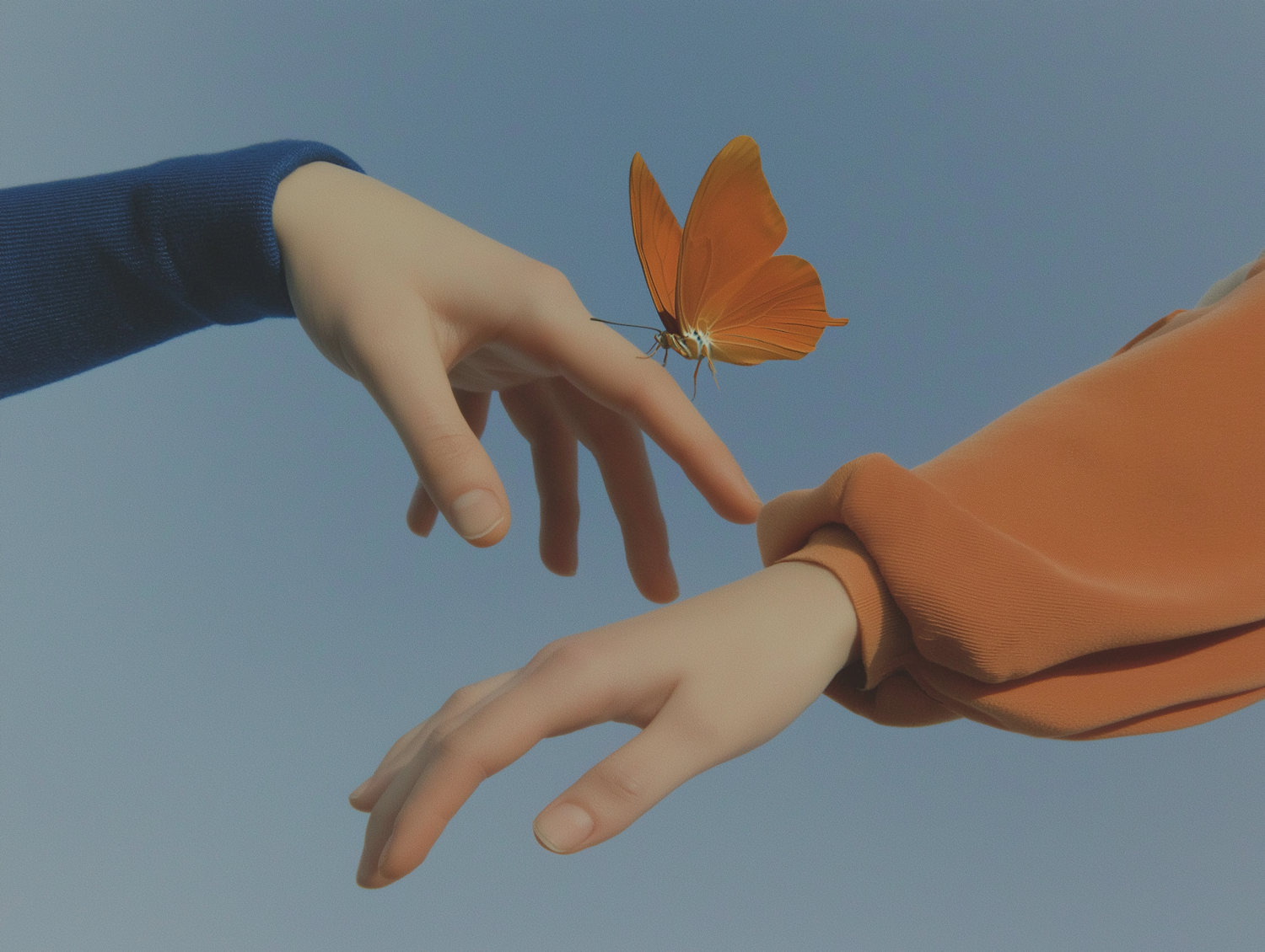 Two hands reaching towards each other with a vibrant orange butterfly perched, set against a clear blue sky, creating a serene moment.