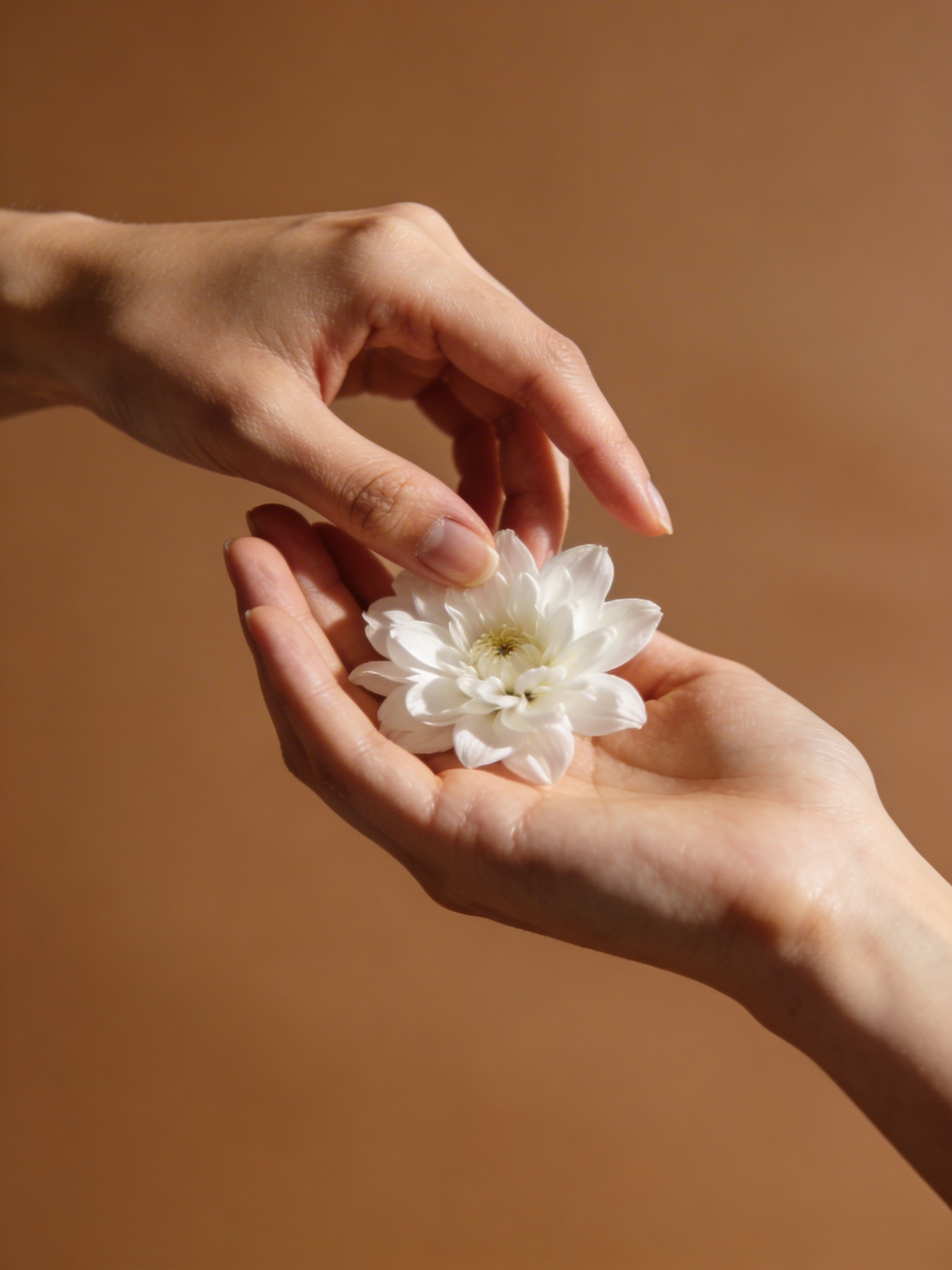 Ultra-realistic studio photograph of one woman's hand gently passing a white flower to another woman's hand, symbolizing appreciation and women's day celebration, warm studio lighting, soft shadows, clean warm brown background, highly detailed skin texture, editorial photography, 85mm lens