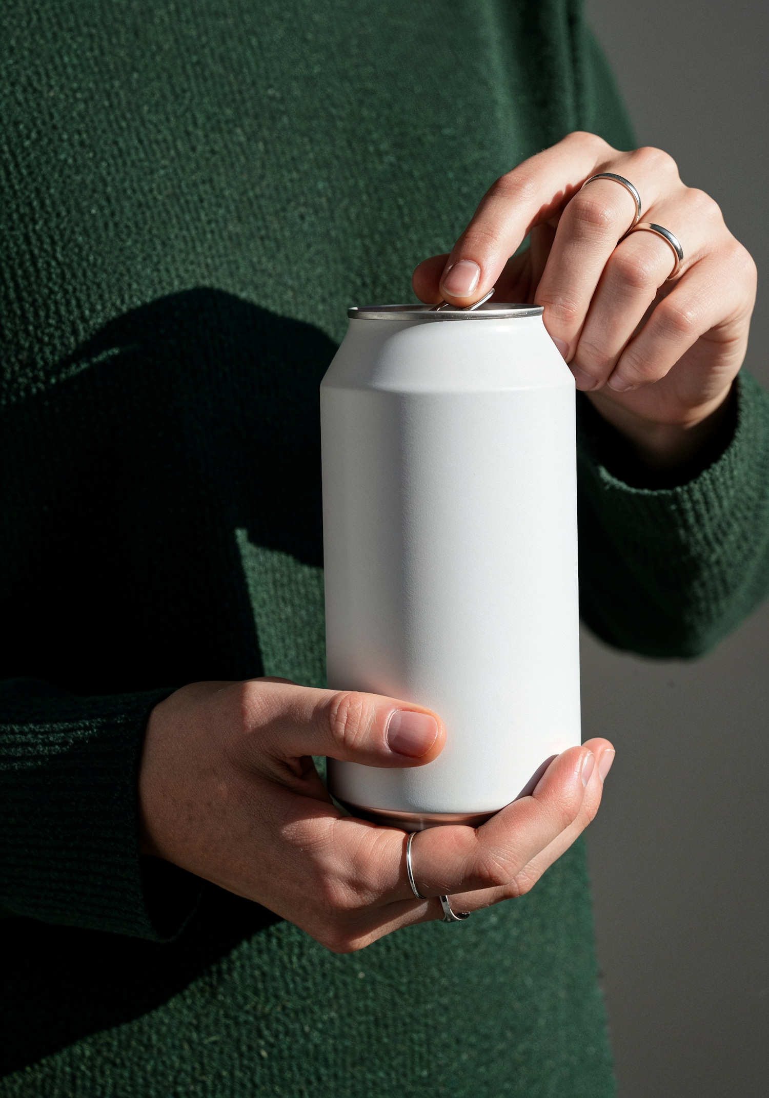 Minimalist close-up of hands holding a plain white can, wearing silver rings and a green sweater, ready to open the tab.