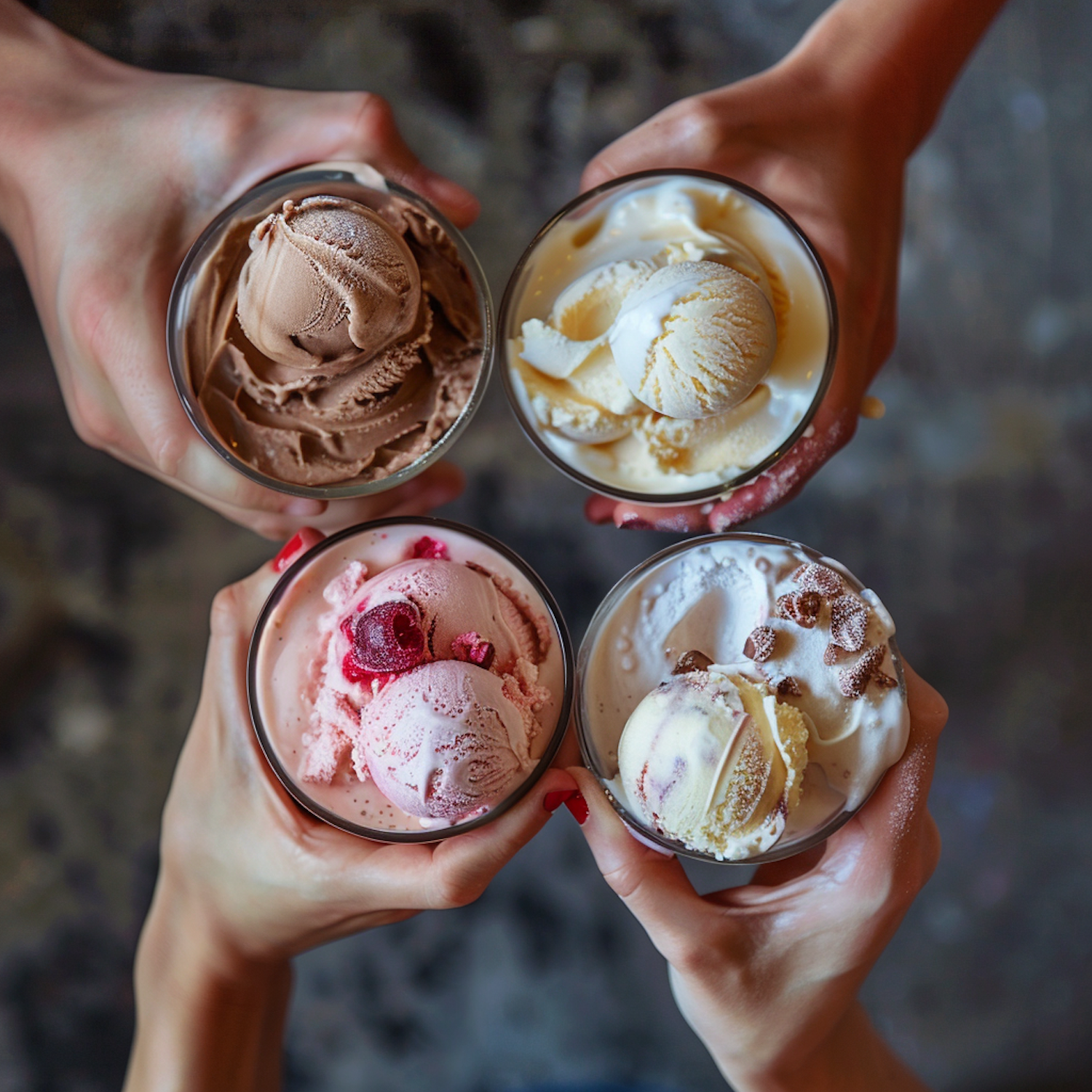 Four hands holding glasses of chocolate, vanilla, raspberry, and chocolate chip ice cream on a dark background.