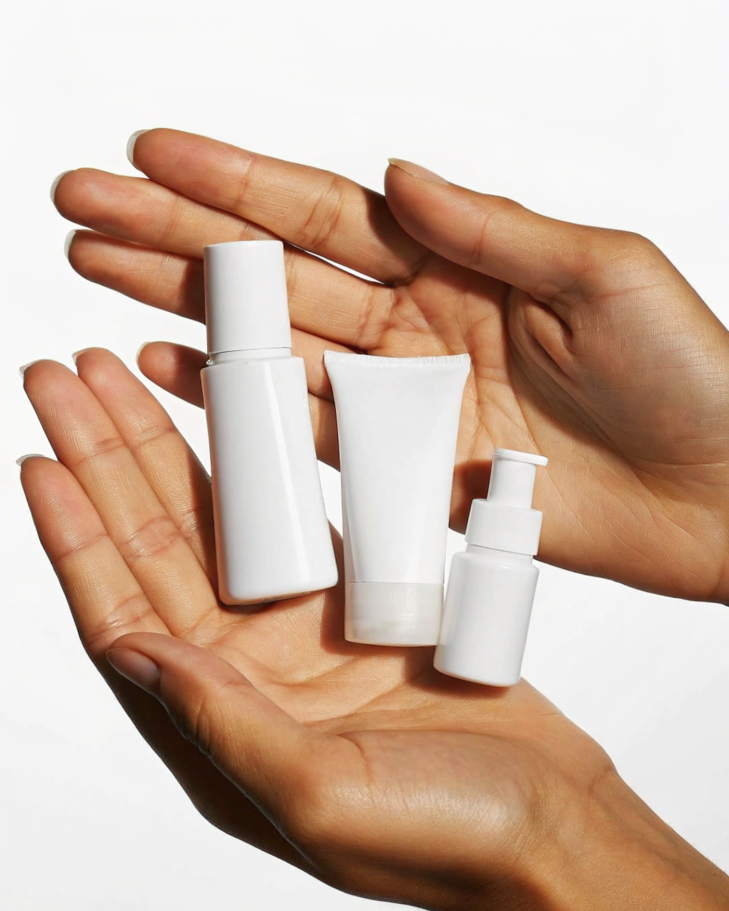 Minimalist white cosmetic bottles cradled in hands with a clean background, showcasing skincare or beauty product packaging.