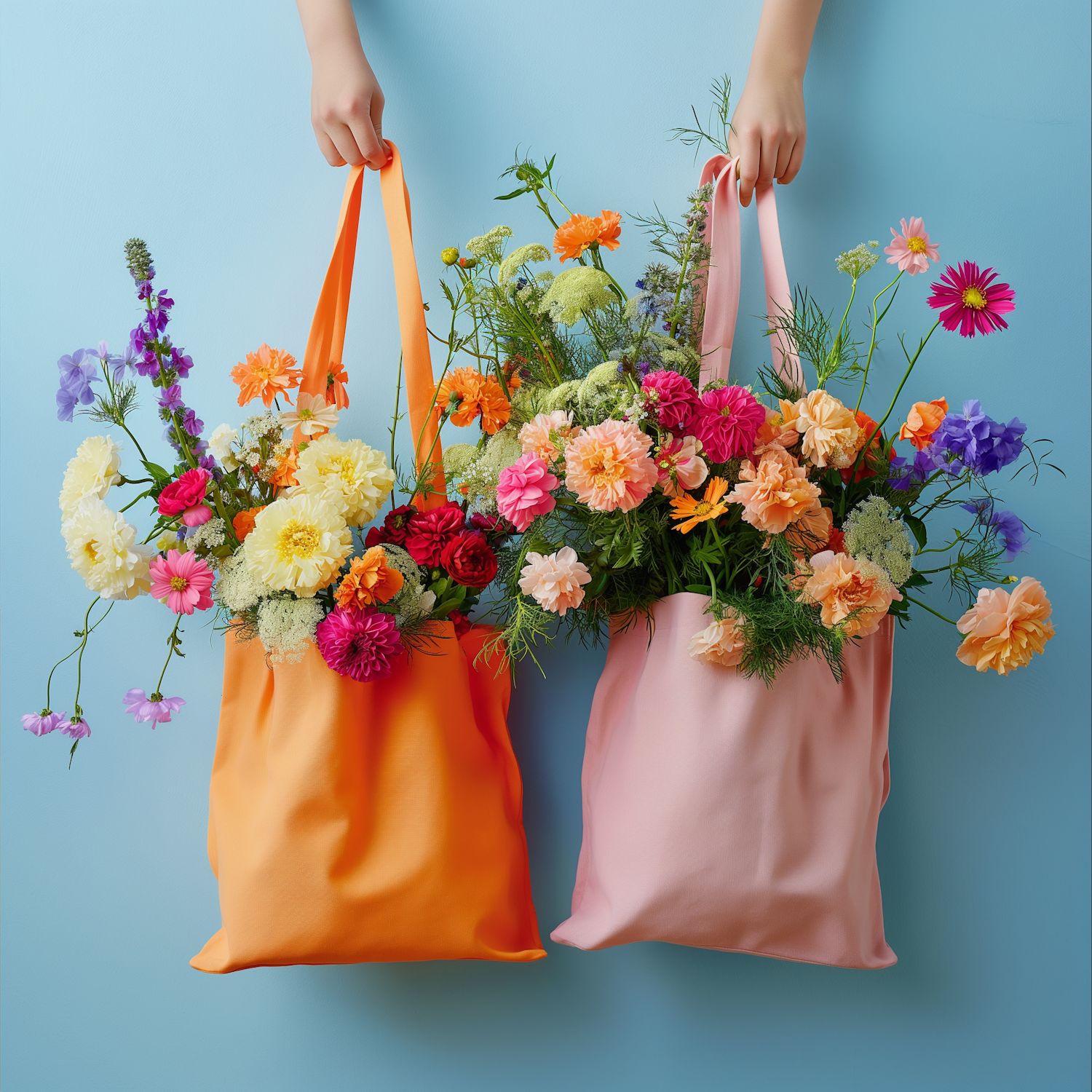Hands Holding Flower-Filled Tote Bags