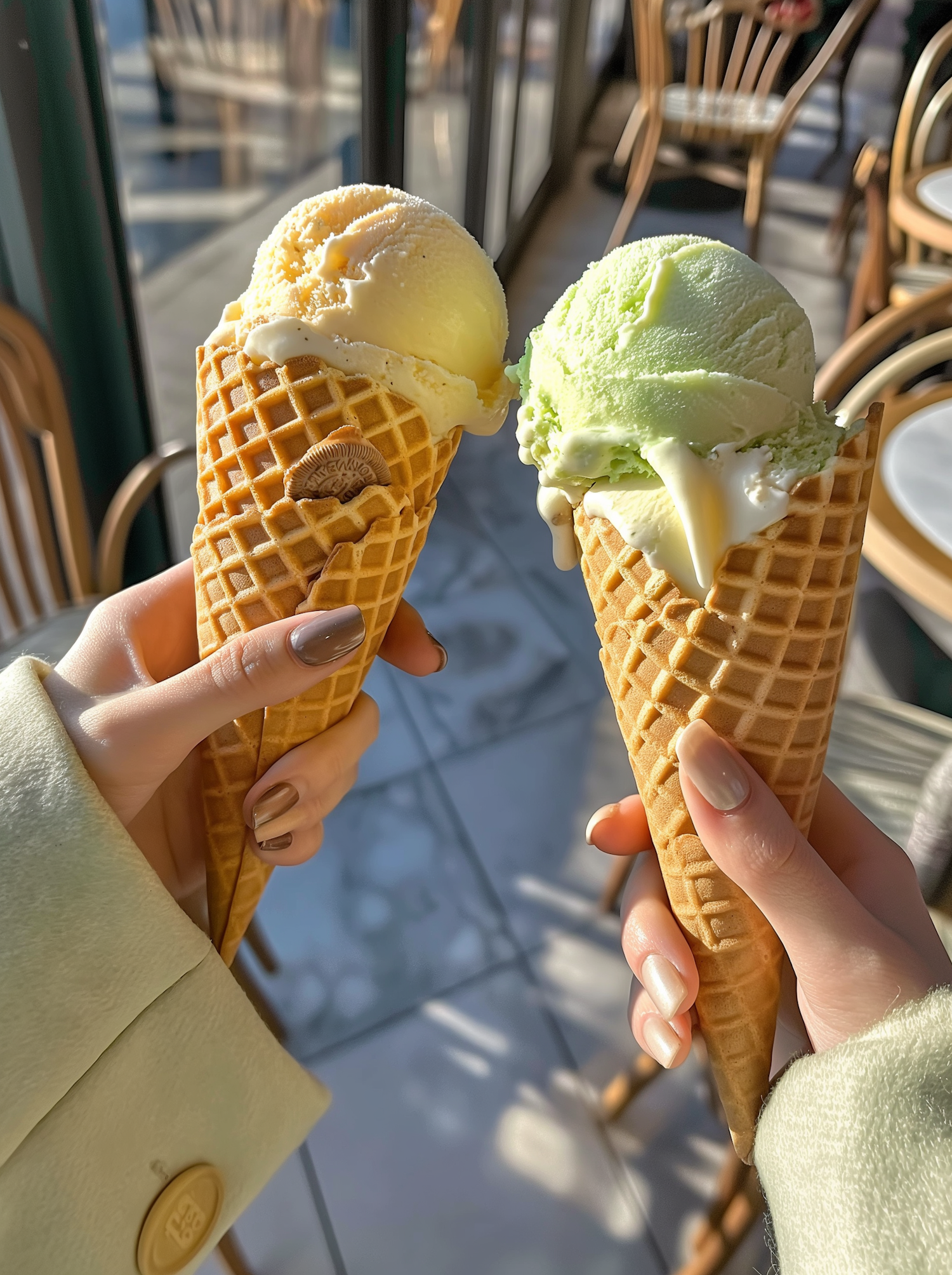 Two hands holding waffle cones with yellow and green ice cream in a sunlit cafe setting.