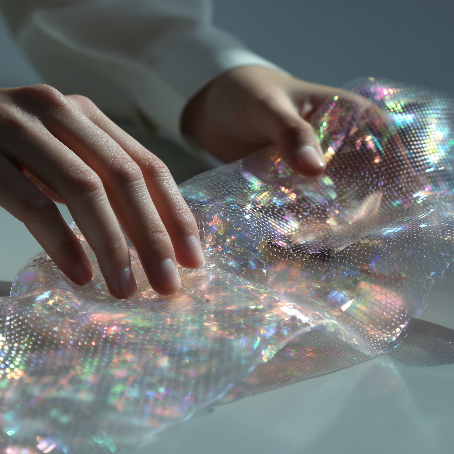 Hands delicately holding a shimmering, iridescent material that reflects a spectrum of colors under soft lighting.