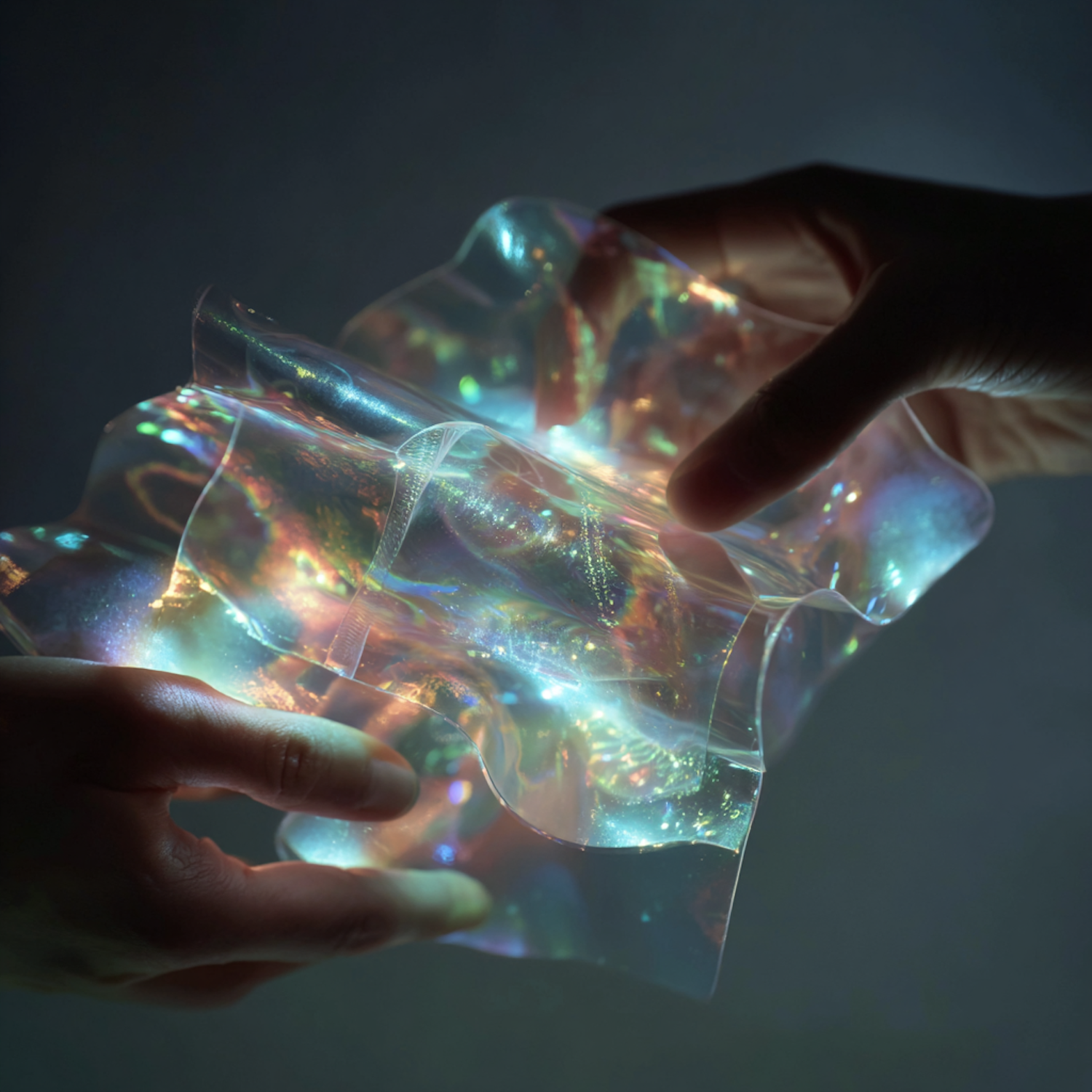 Hands holding a glowing, iridescent material that reflects light in vibrant colors, creating a mesmerizing and futuristic visual effect.