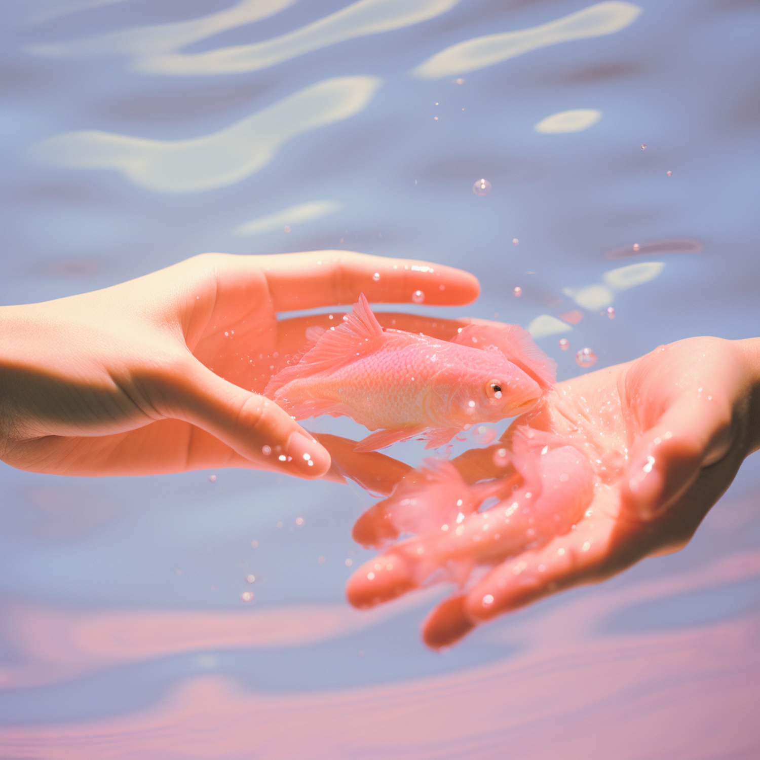 A serene scene of hands gently holding a pink fish above rippling blue water, showcasing care and vibrant colors.