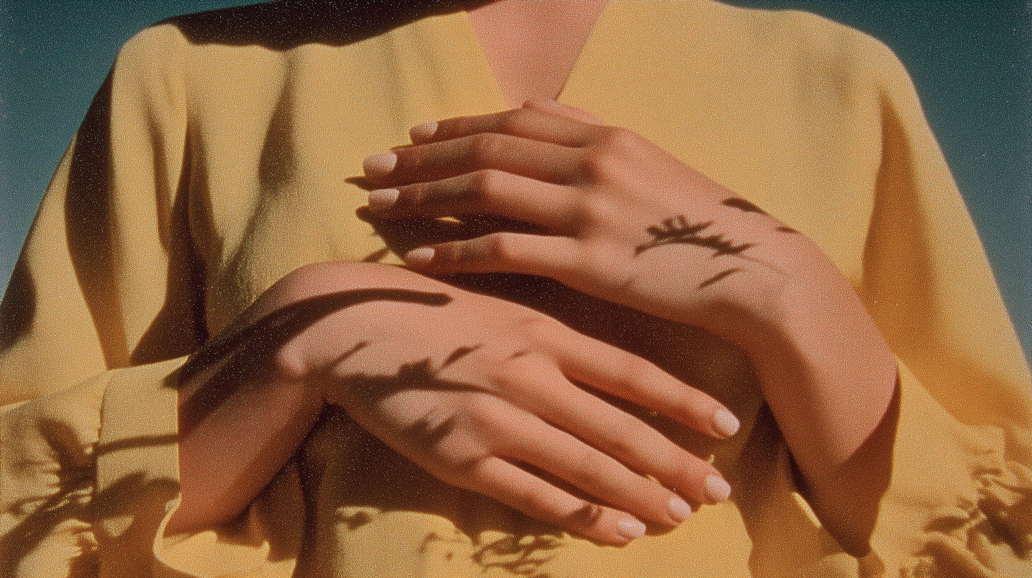 Close-up of hands resting with plant shadows, wearing a yellow garment against a blue background, emphasizing light and texture.