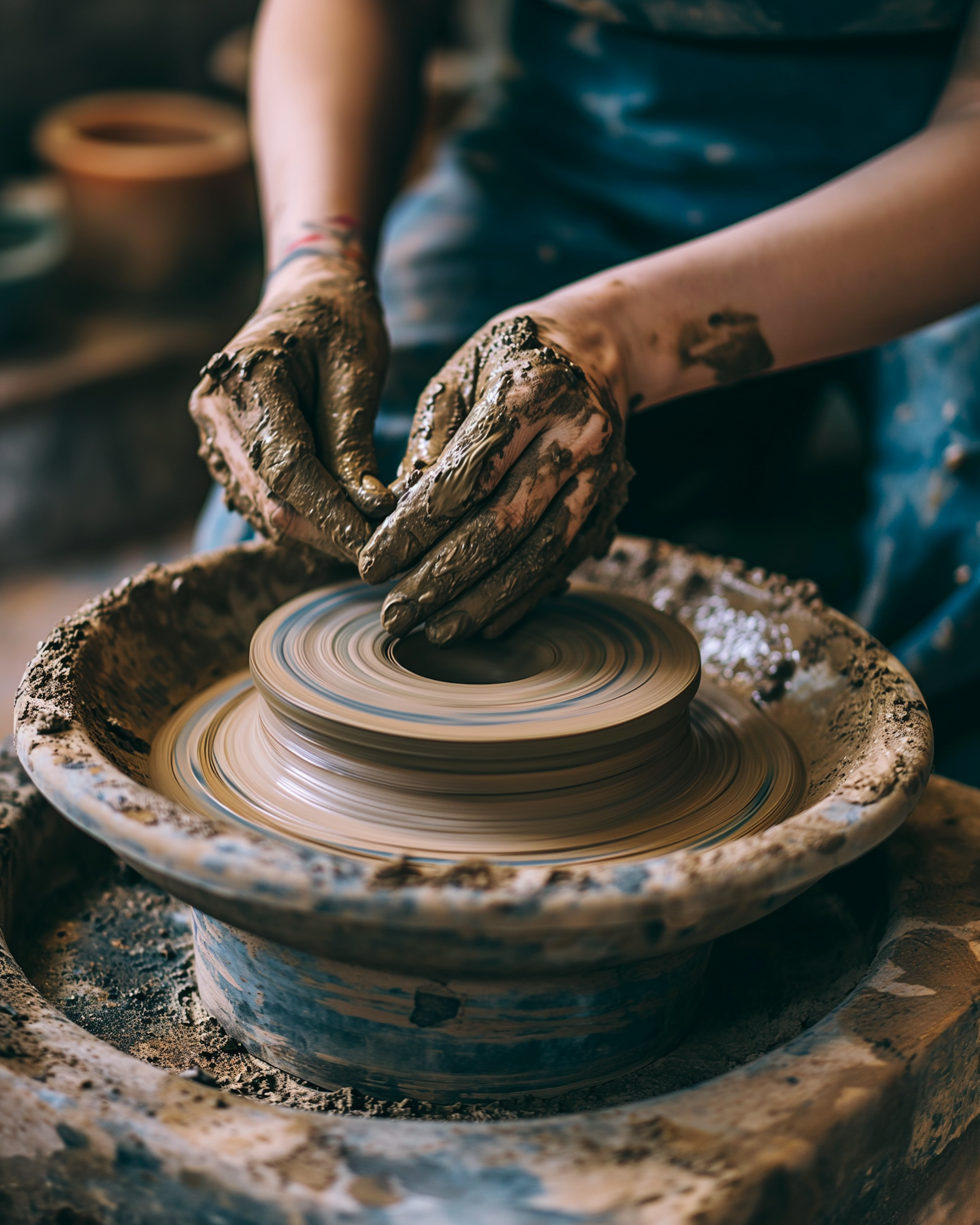 Close-up of hands shaping clay on a pottery wheel, showcasing the art of pottery making with earthy tones and dynamic motion.
