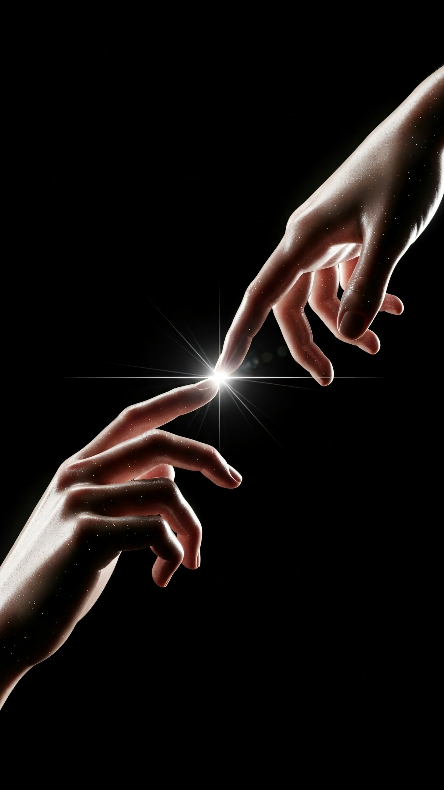 Two hands reaching towards each other with a glowing light at their fingertips, set against a black background, symbolizing connection.
