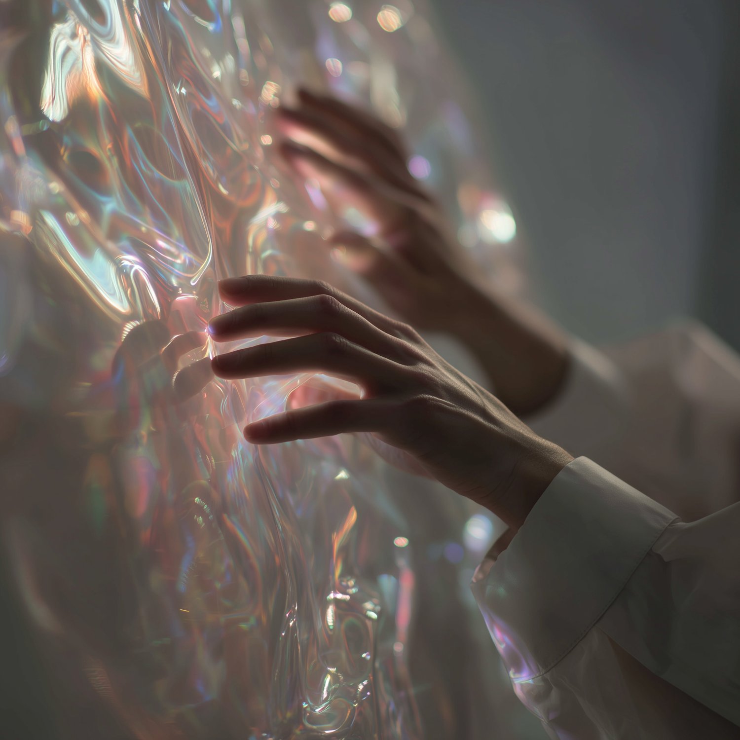 Hands gently touching a shimmering, iridescent surface, creating a mesmerizing play of light and color in a soft, ethereal setting.