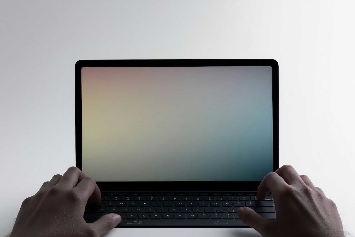 Hands poised on a laptop keyboard with a blank pastel gradient screen, set against a minimalist white background.