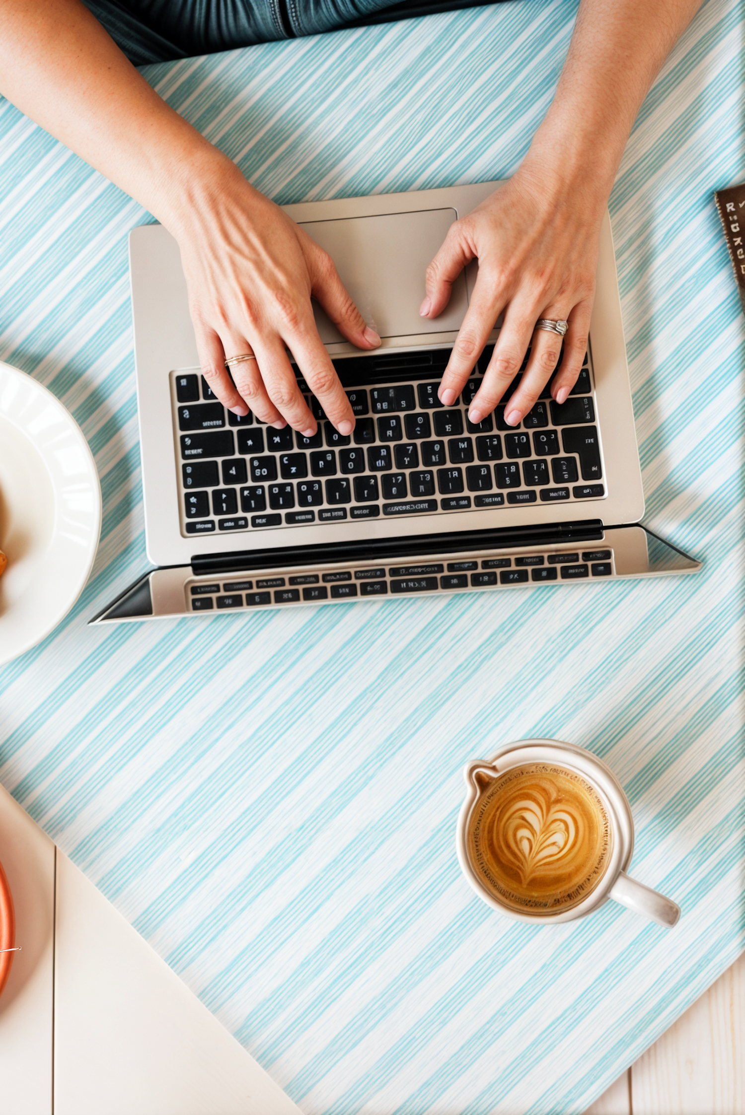 Hands typing on a laptop with coffee and pastry on a striped tablecloth, creating a cozy workspace vibe.