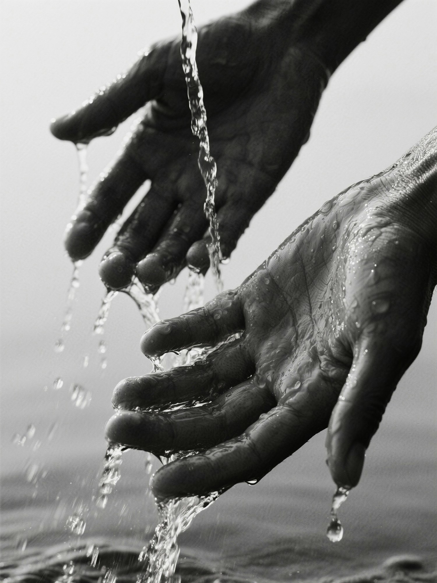Hands caught mid-motion as a stream of water runs across the palms and drips between the fingers, wet skin shimmering slightly under directional soft light. Droplets catch the light in motion, creating fluid lines and glistening highlights. The background is blurred and neutral, ensuring full focus on the water’s path and the skin’s surface. Shot in high-grain black and white, the image evokes raw physicality and quiet emotion.