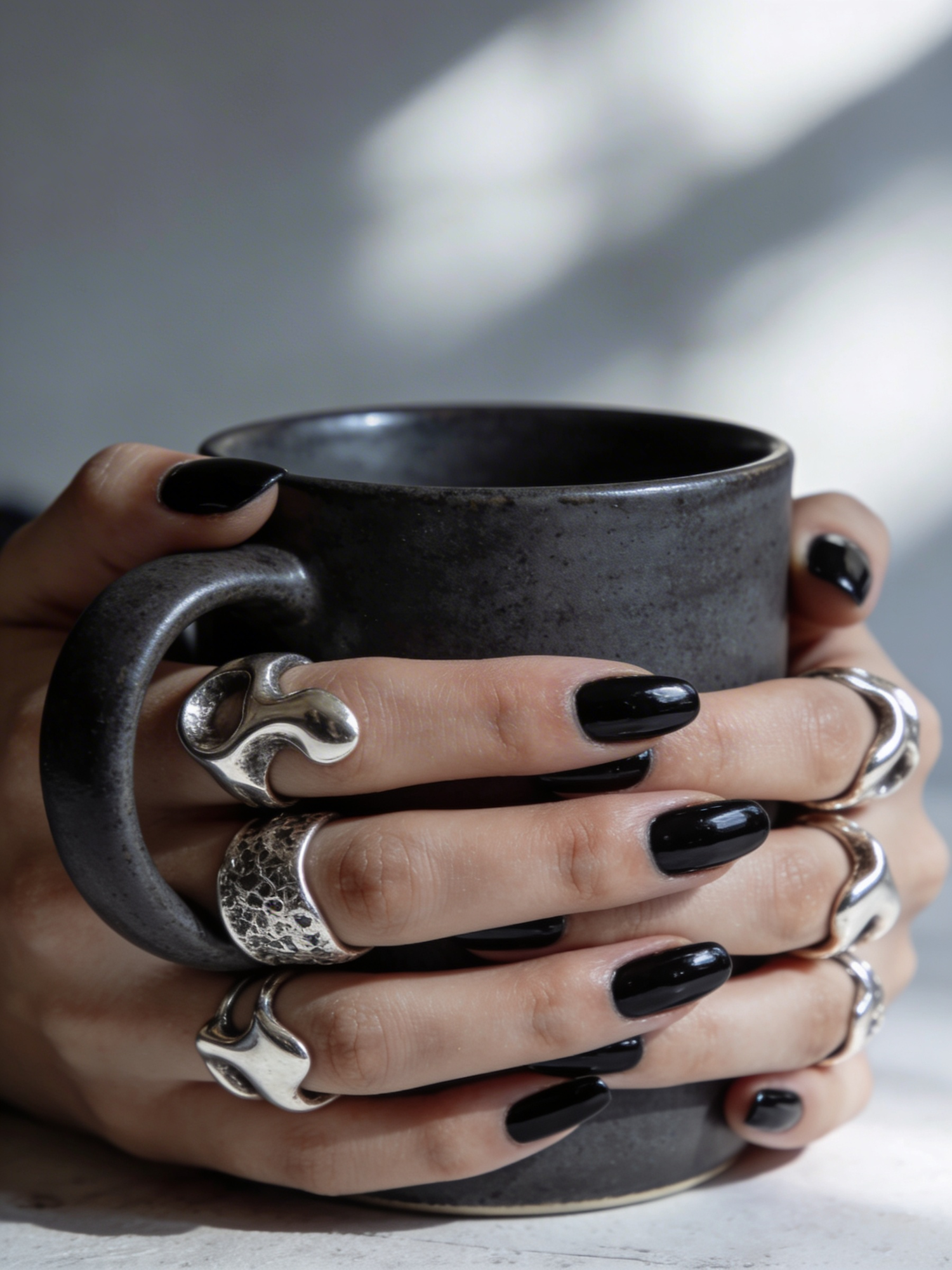 Close-up of hands with silver rings and black nails holding a dark ceramic mug, showcasing artistic jewelry and a minimalist aesthetic.