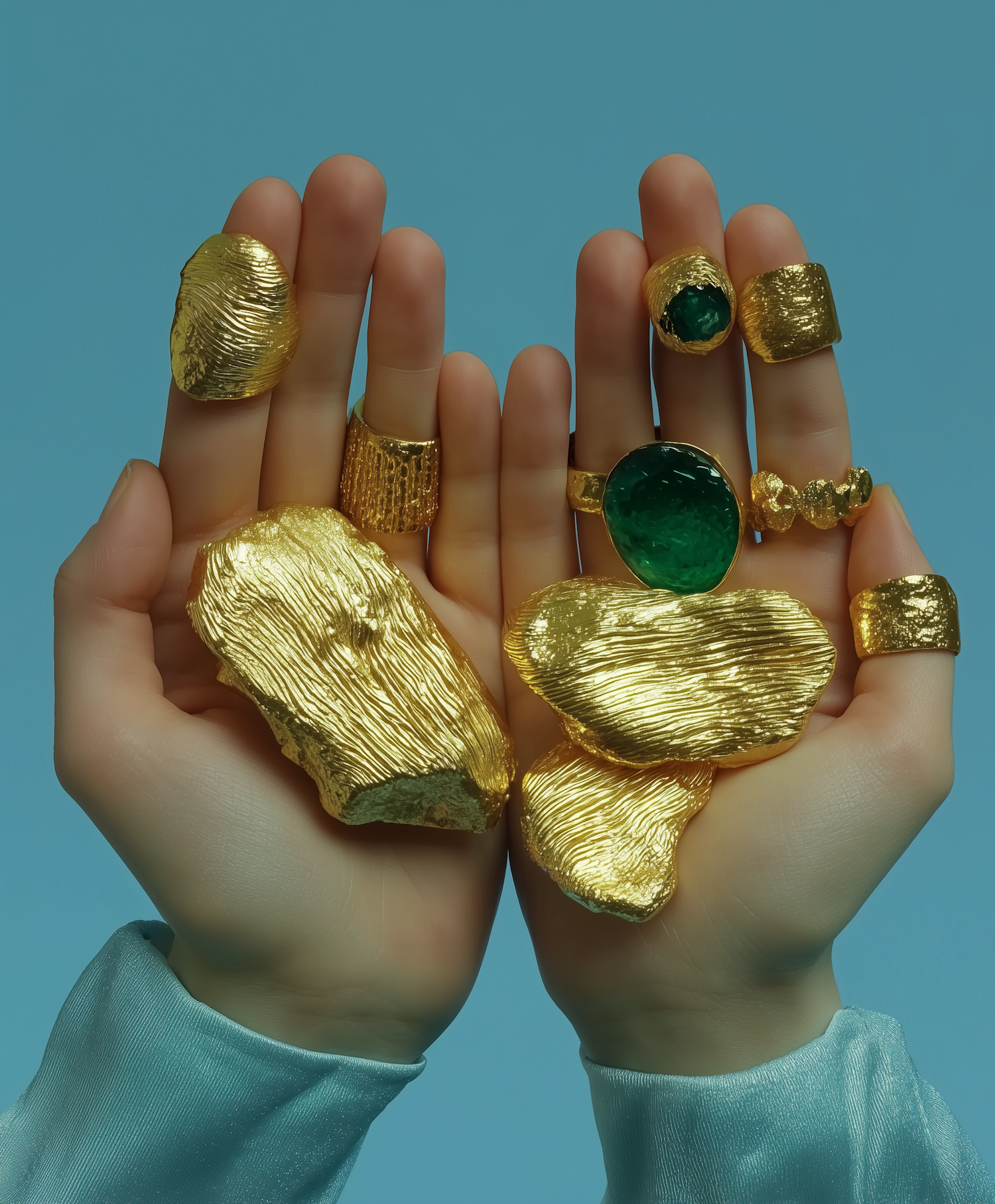 Hands adorned with gold rings and holding textured gold nuggets, set against a blue background for a luxurious and vibrant look.