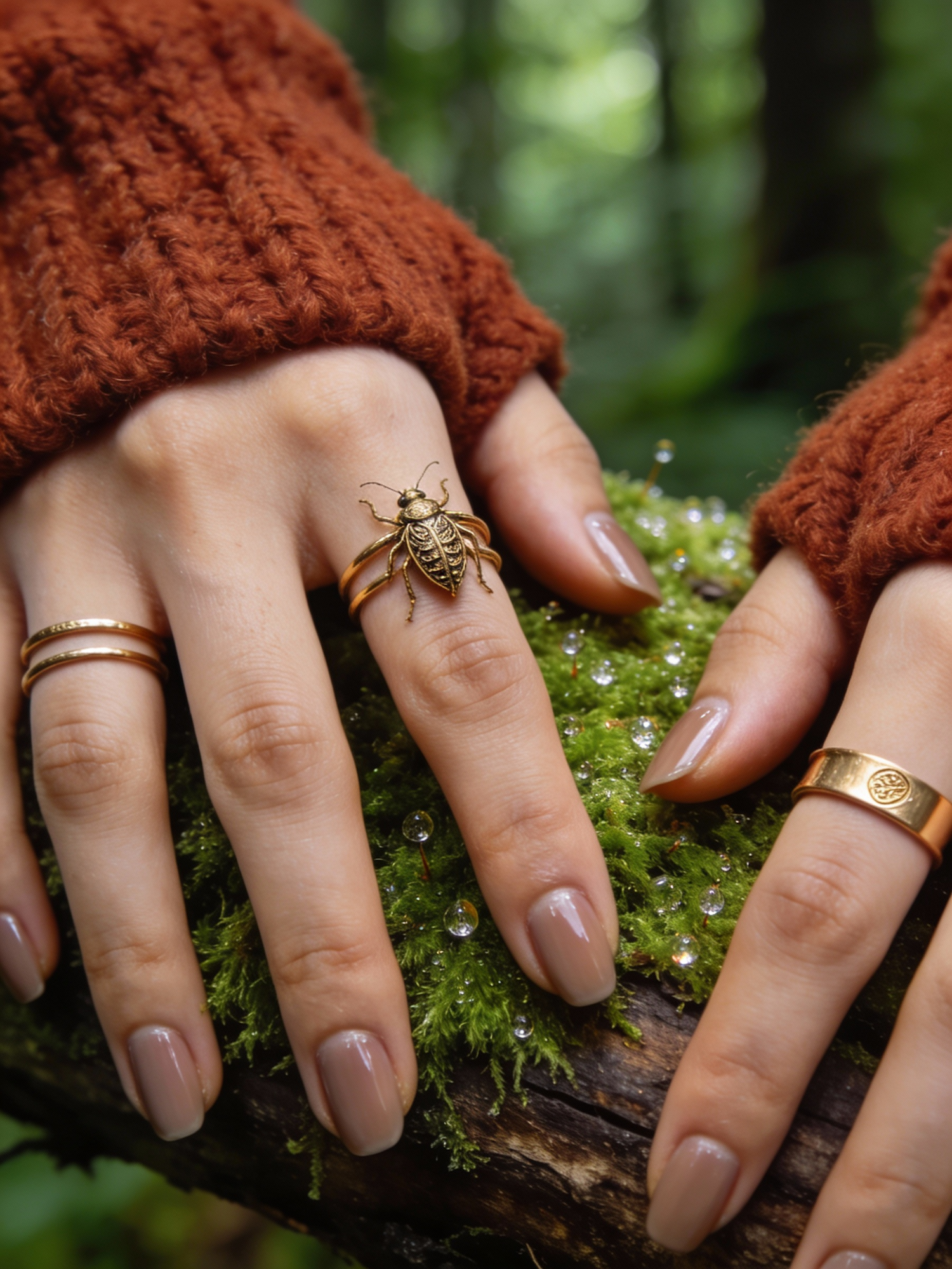 Macro/close-up of both hands resting on vivid moss-covered log in a forest, wearing chunky rust-brown wool knit sleeves pushed down to knuckles, stacked thin gold rings + one insect-inspired ring, short natural nails with sheer taupe polish; emphasize knit fibers, ring engravings, moss texture with tiny dew droplets; background: soft green forest blur, natural shade, clean minimal framing. ultra-HD 4K fashion editorial photography, razor-sharp focus, extreme detail, modern luxury styling, clean composition, high dynamic range, crisp textures, premium magazine quality, contemporary fashion aesthetic, no grain, no blur, no vintage