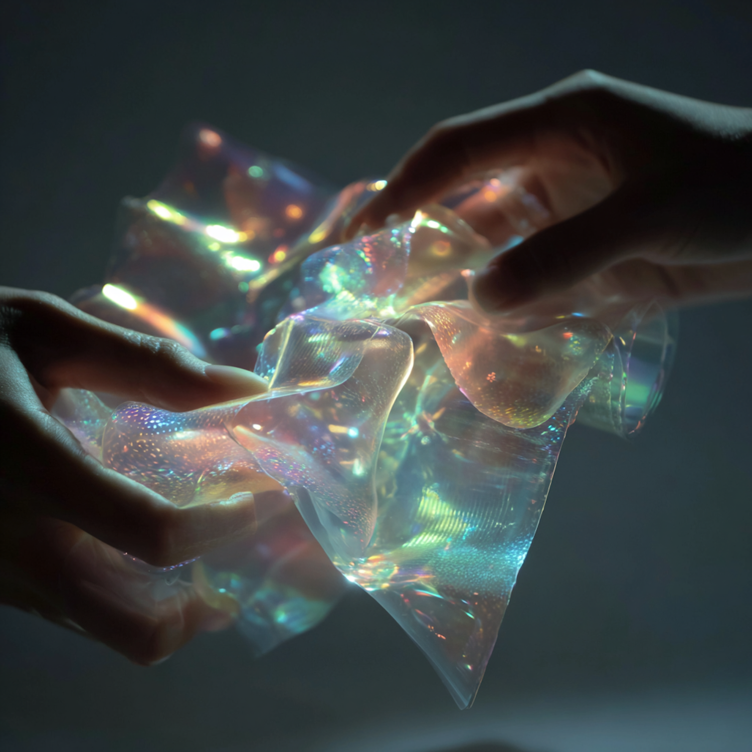 Two hands holding a translucent, iridescent material that reflects vibrant rainbow colors against a dark background.