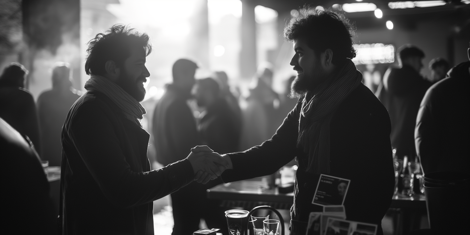 Two men with beards shake hands in a dimly lit social setting, wearing scarves and coats, surrounded by a bustling crowd.