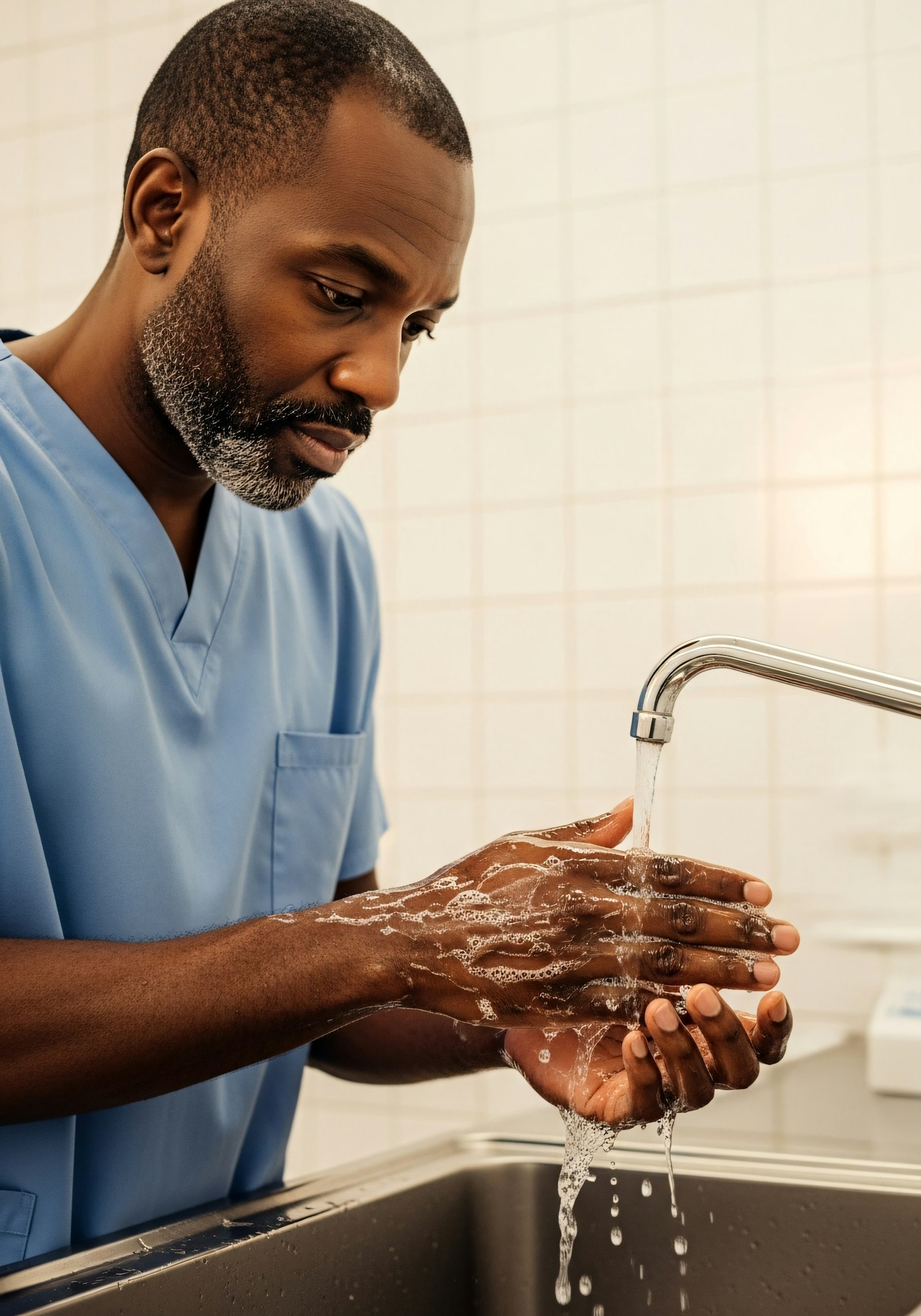 A healthcare professional in blue scrubs washing hands under a faucet, emphasizing hygiene in a clinical setting.