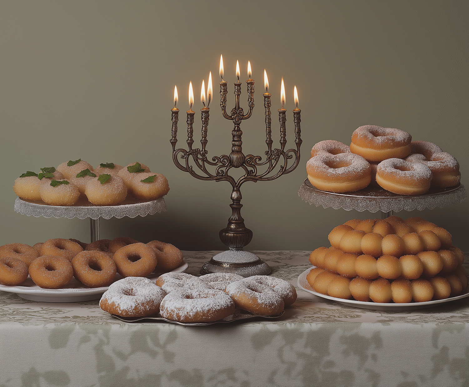 Festive table with assorted donuts and a lit menorah, creating a warm holiday ambiance with elegant presentation.