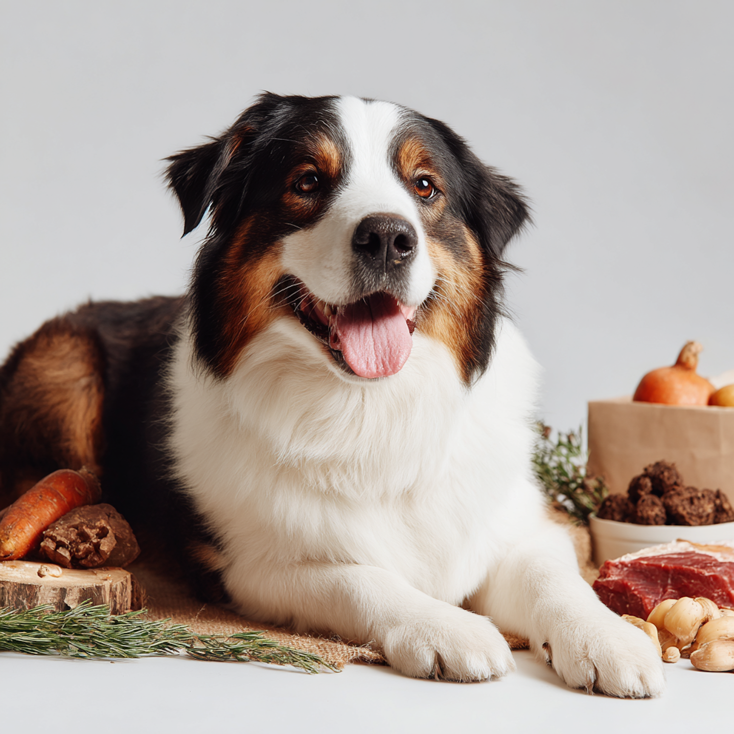 A happy Australian Shepherd dog surrounded by fresh ingredients like carrots, rosemary, and raw meat, set against a neutral background.