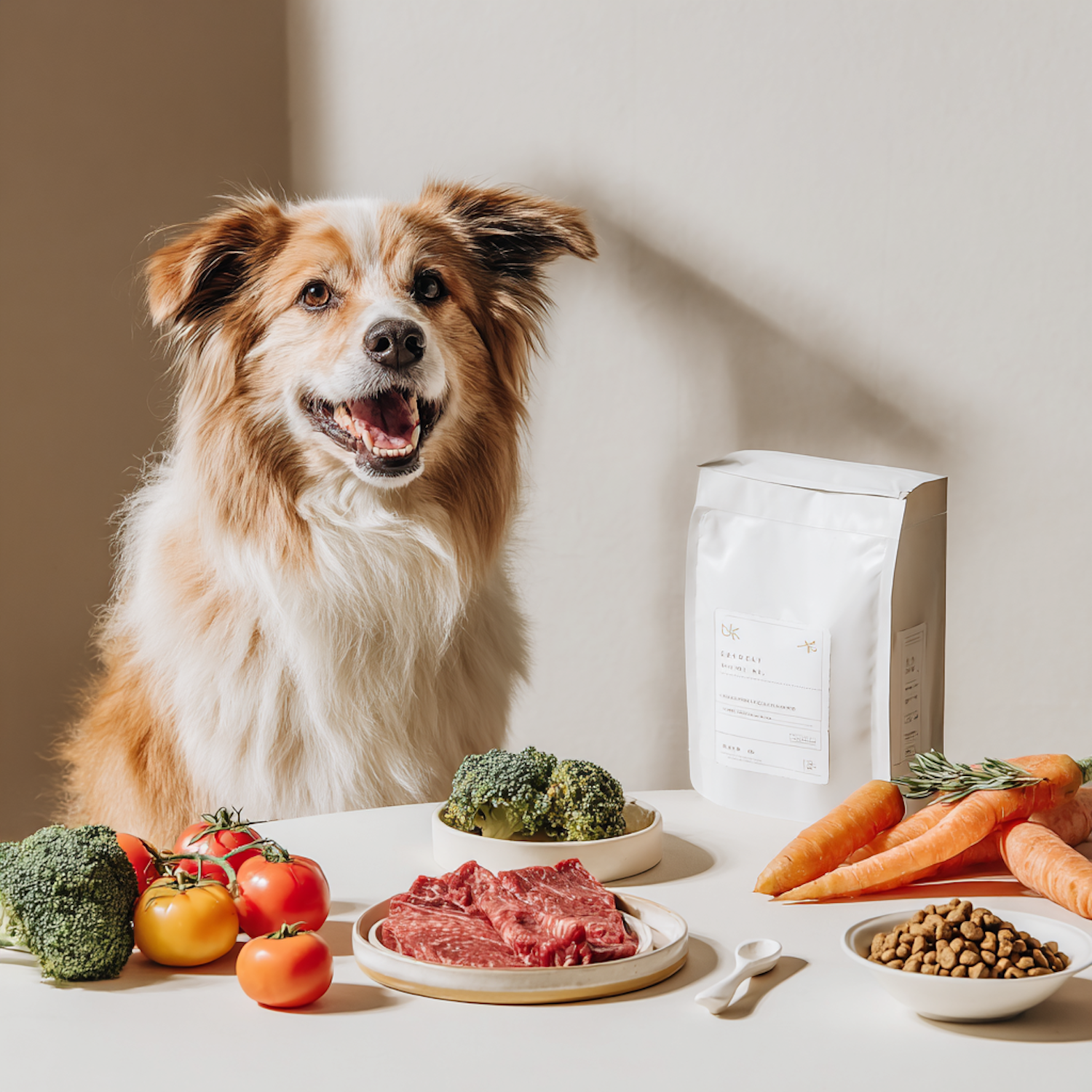 A happy dog sits by a table with fresh vegetables, raw meat, and pet food, showcasing a focus on healthy pet nutrition.