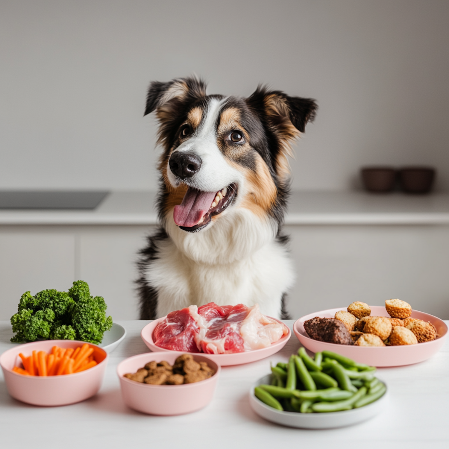 A joyful Border Collie sits at a table with bowls of broccoli, raw meat, carrots, and more, showcasing a variety of dog-friendly foods.