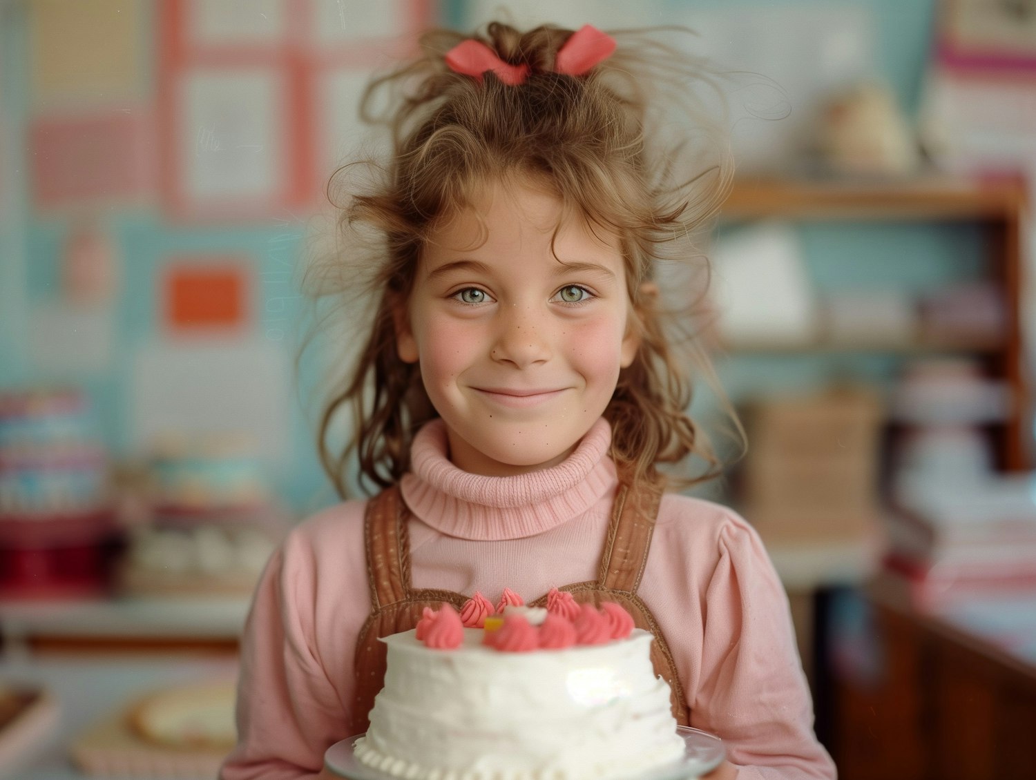 Smiling girl with light brown hair holds a cake with pink frosting, wearing a pink sweater and brown overalls in a cozy setting.