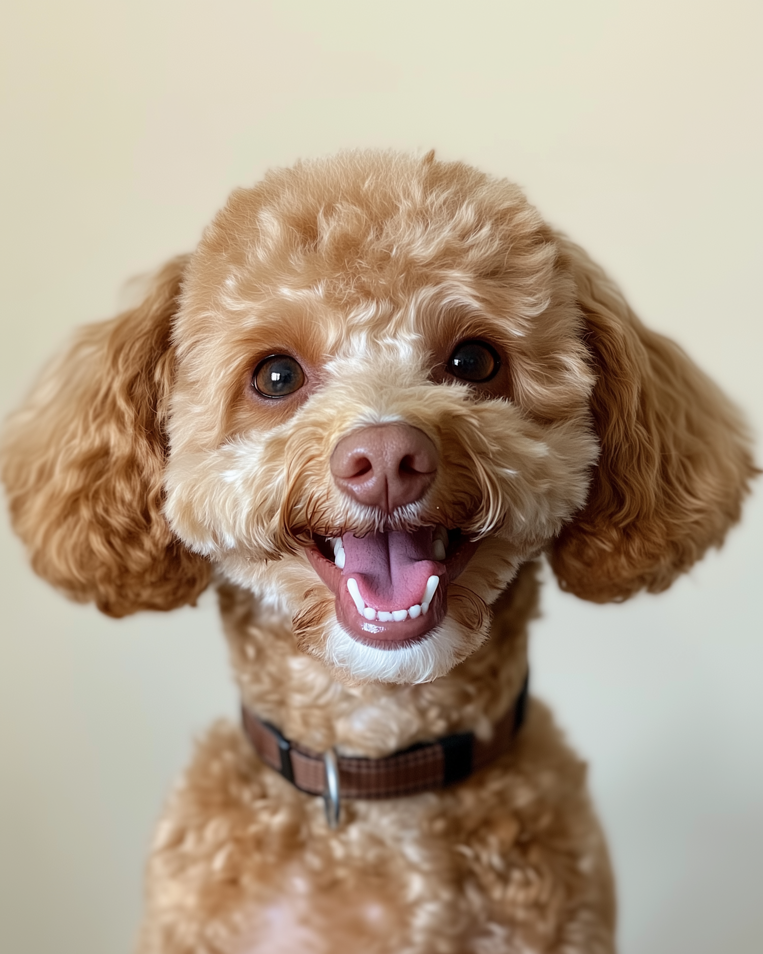 Adorable fluffy dog with curly light brown fur and a happy smile, wearing a brown collar. Close-up shot with a neutral background.