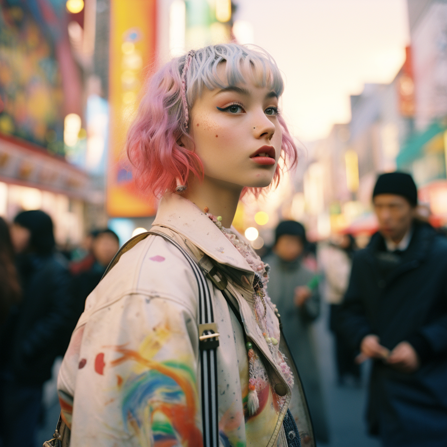 Young woman with pastel hair and colorful jacket in a bustling city street, surrounded by blurred lights and people, exuding a vibrant style.