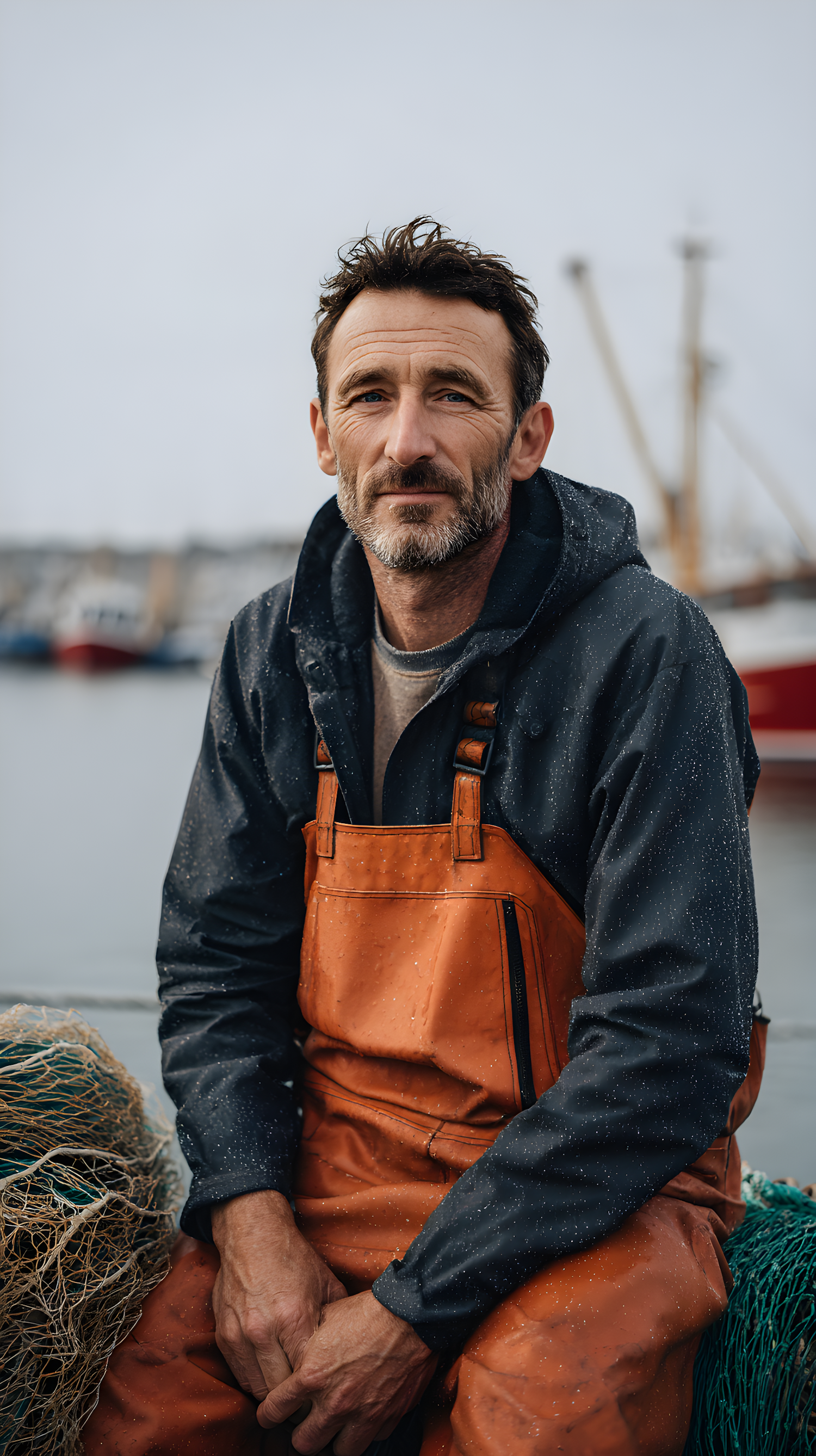 A fisherman in orange overalls sits by a harbor, with fishing boats in the background, exuding a calm and reflective demeanor.