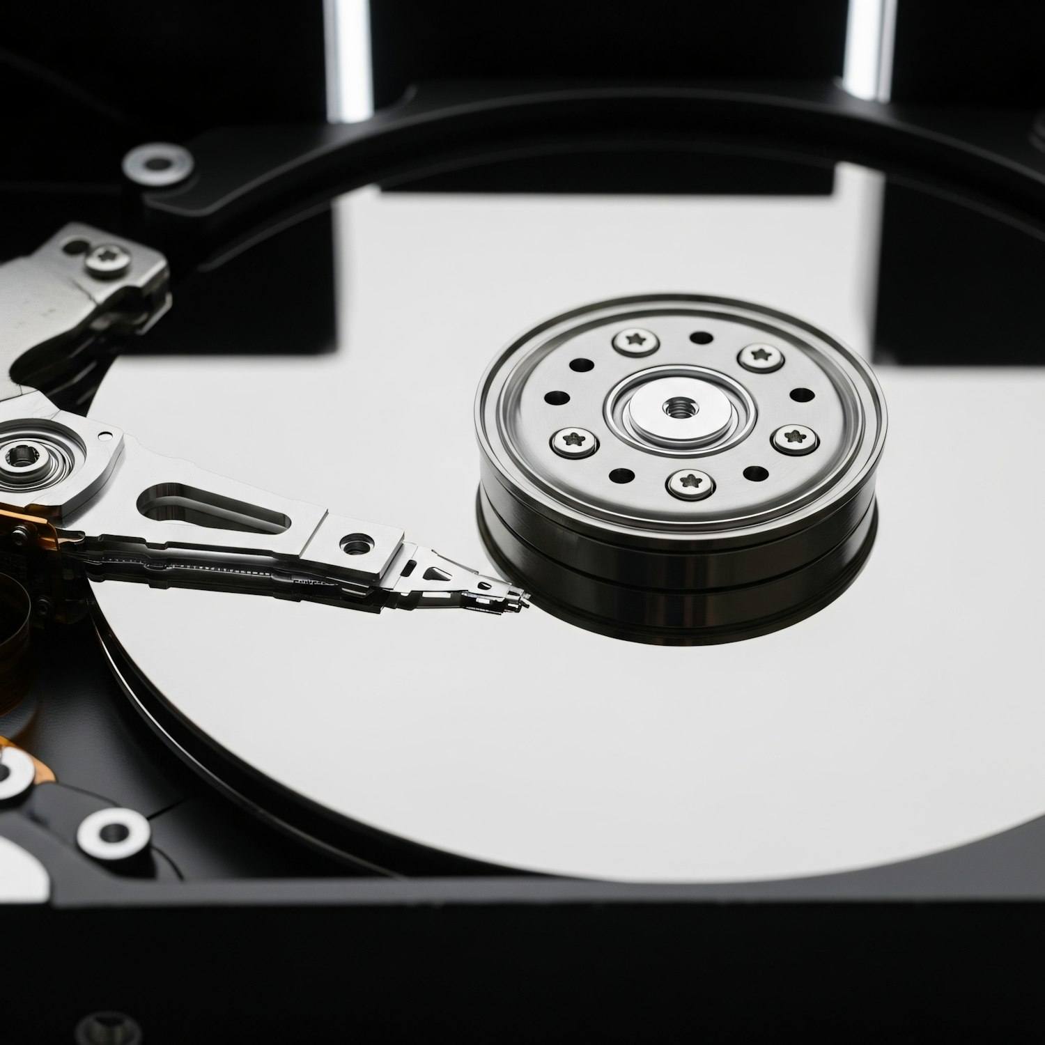 Close-up of a hard disk drive's internal components, showcasing the platter, read/write head, and spindle motor in sharp detail.