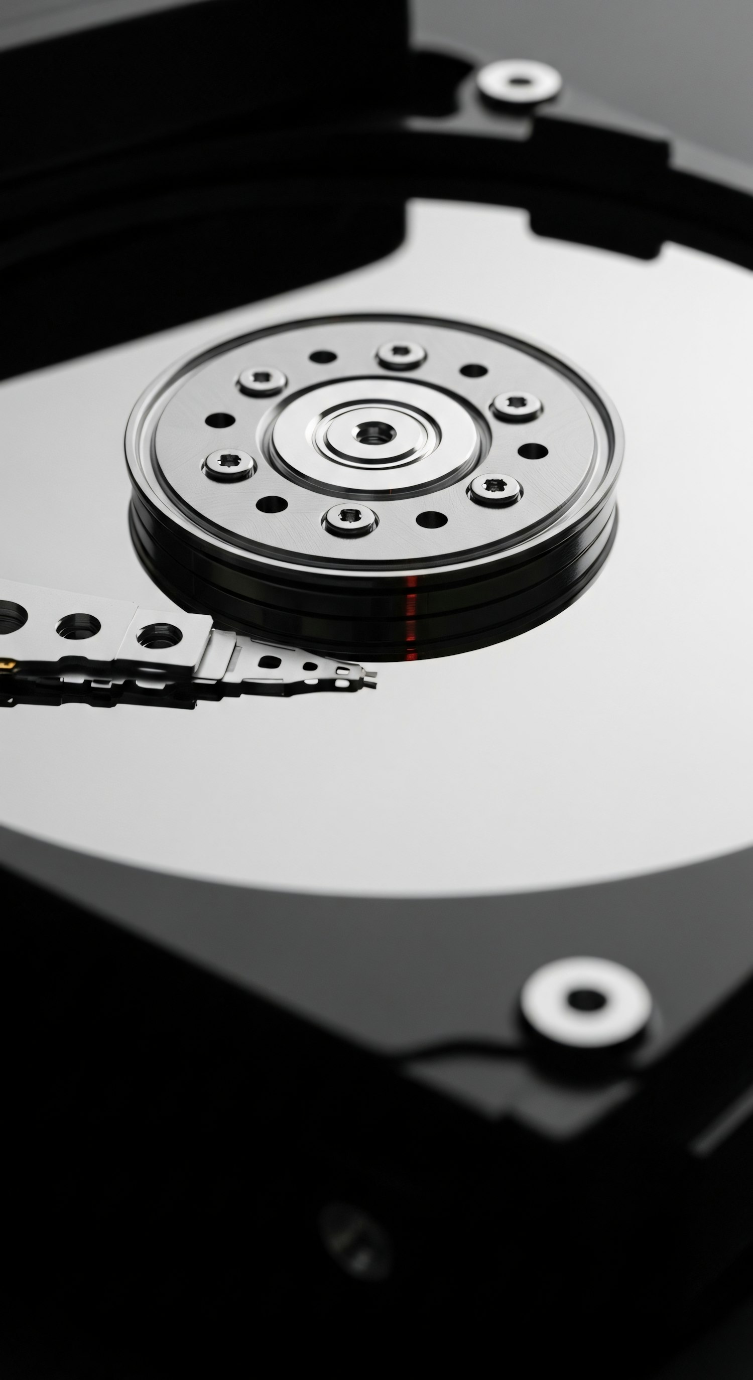 Close-up of a hard disk drive's internal components, featuring the reflective platters and read/write head in sharp detail.