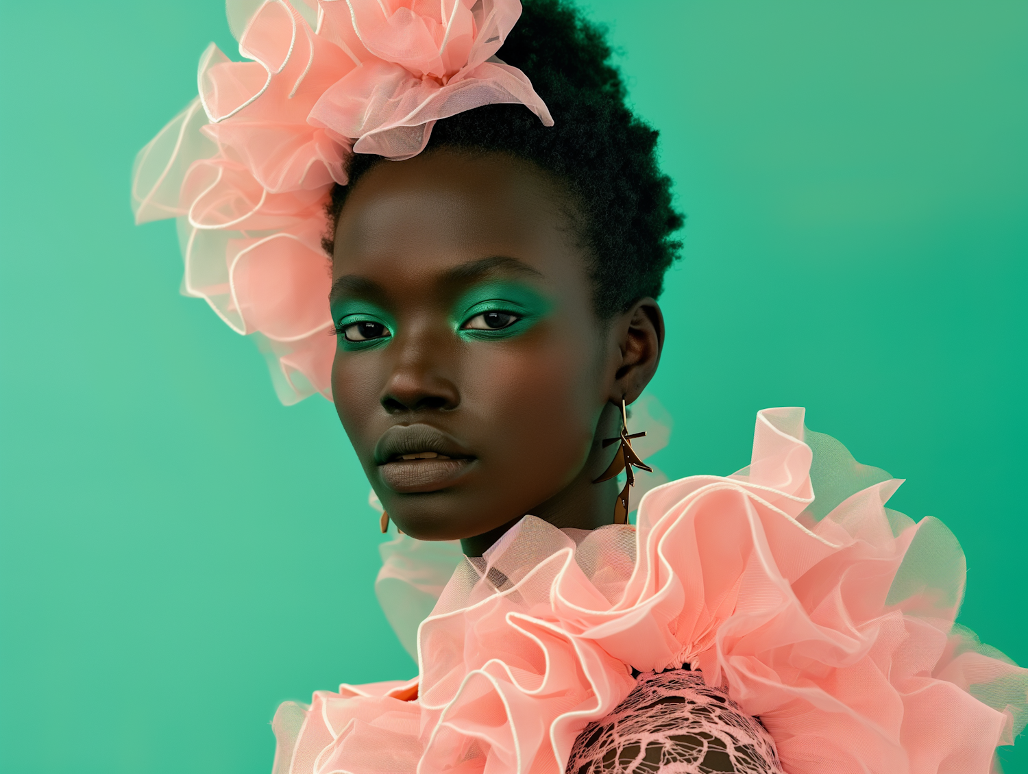 Portrait of a woman with vibrant turquoise eyeshadow and pink ruffles against a bright green background.