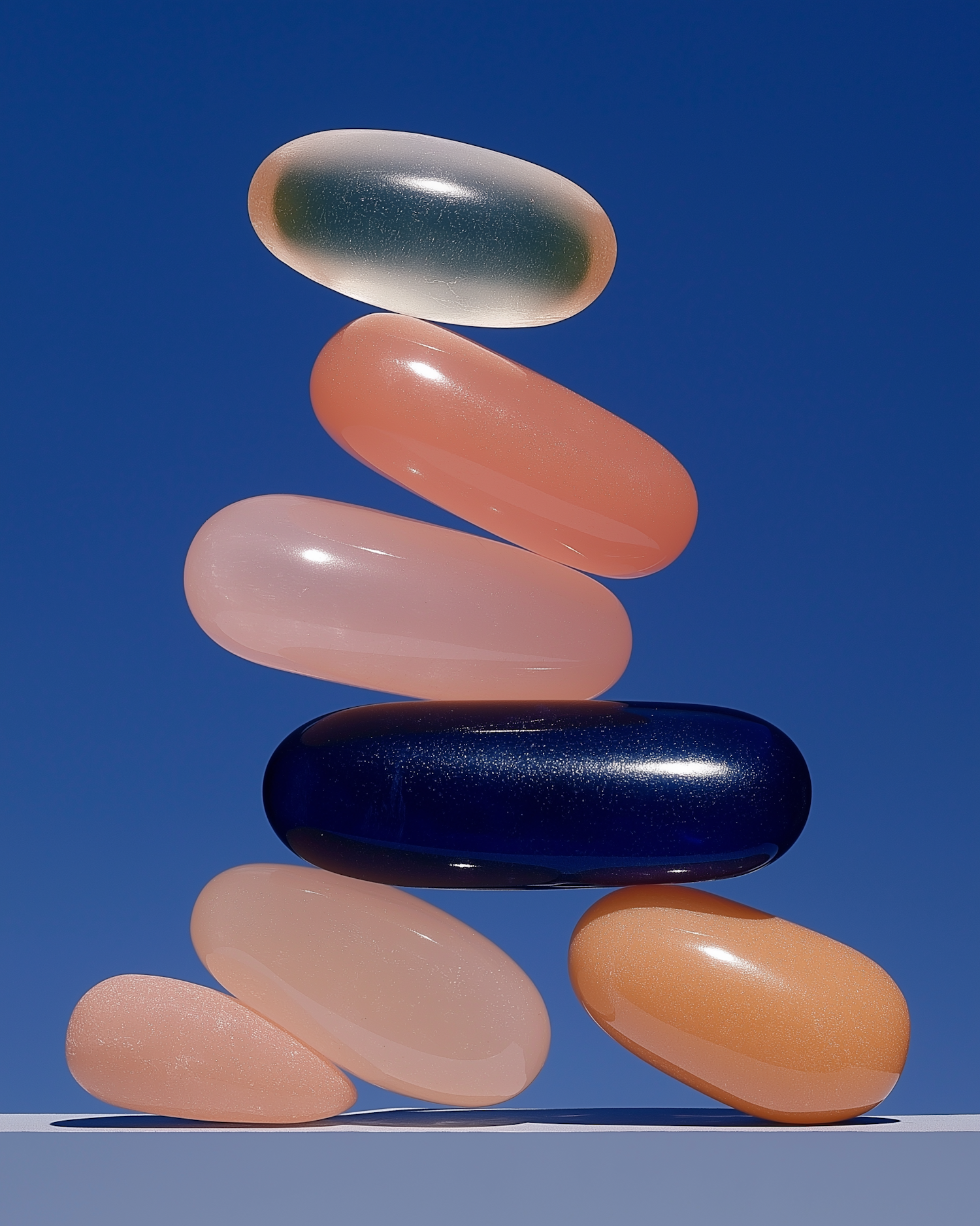 A stack of colorful, glossy stones balanced against a clear blue sky, showcasing harmony and vibrant hues.