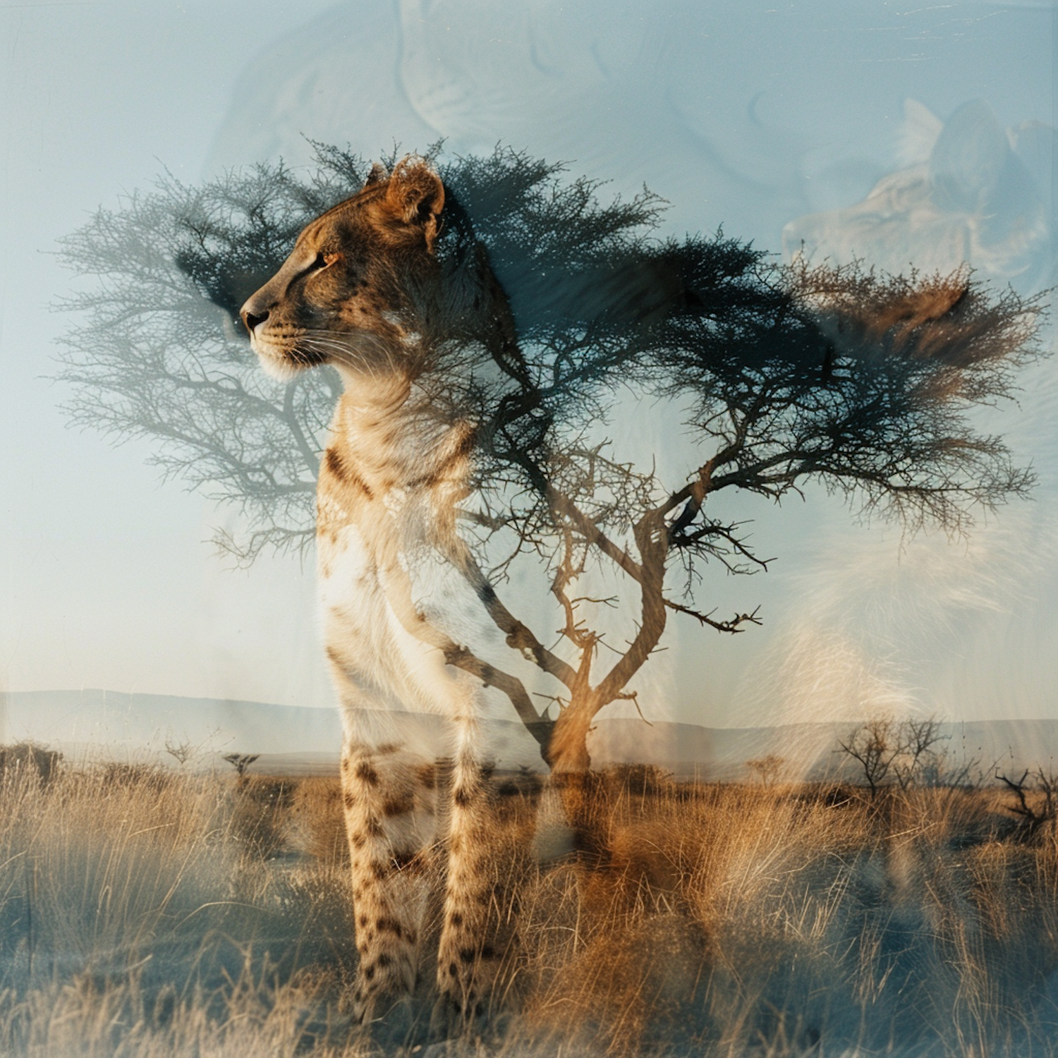 Double exposure of a cheetah and African savanna, blending wildlife and nature in a captivating scene.