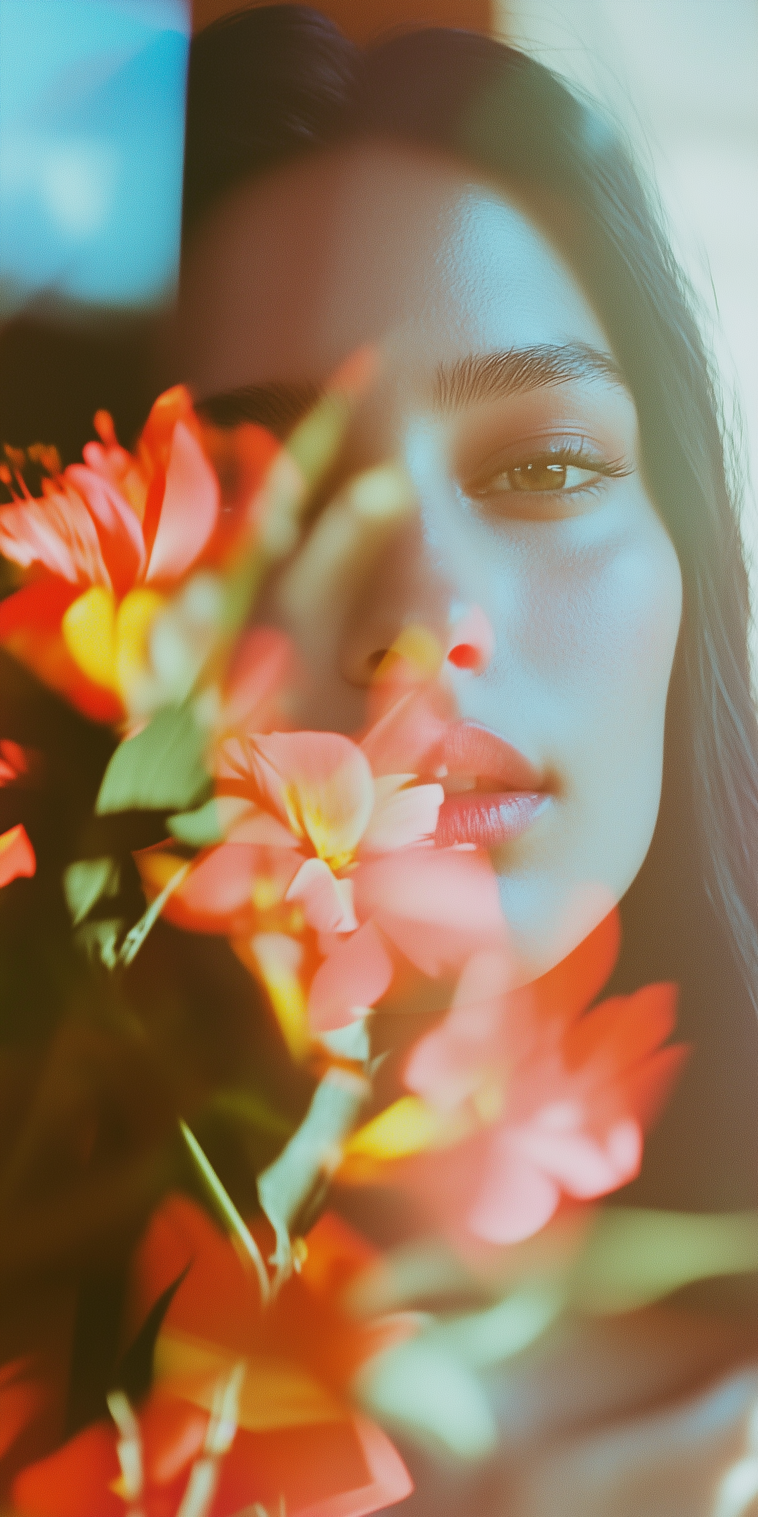 A serene portrait of a woman with vibrant flowers, blending natural beauty and vivid colors in a dreamy composition.