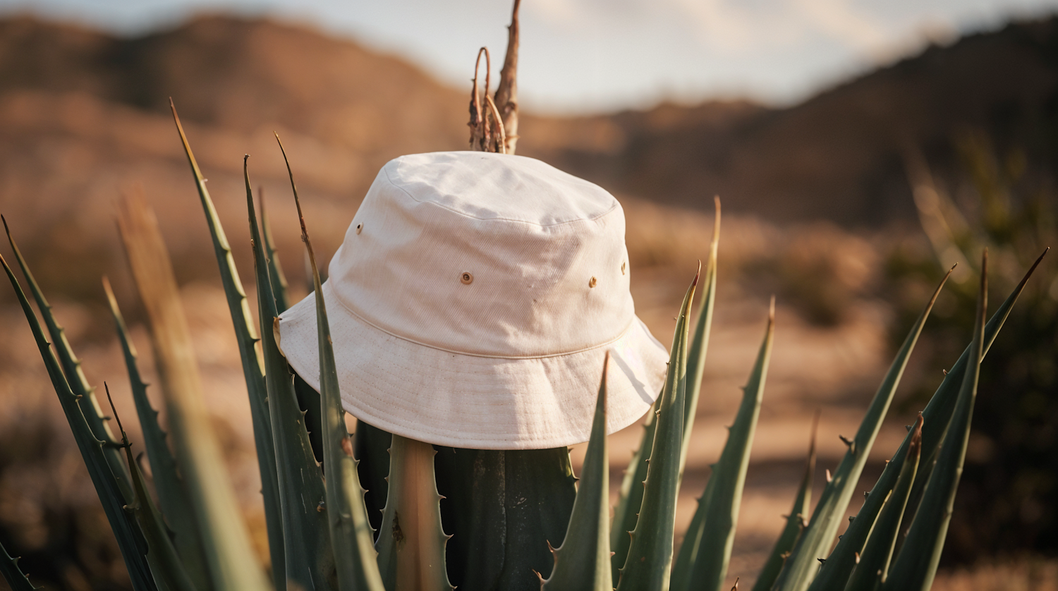 White bucket hat on a spiky agave plant in a sunlit desert landscape, blending man-made and natural elements.