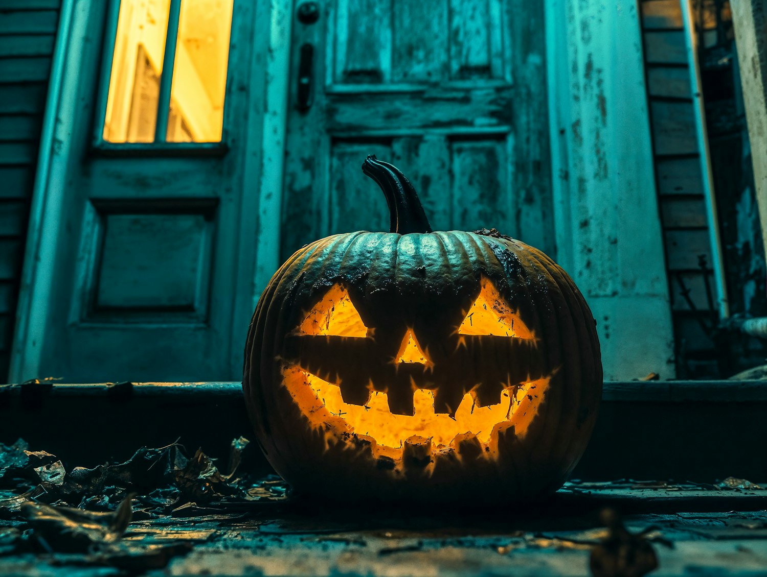 Glowing jack-o'-lantern on a weathered porch, casting an eerie Halloween glow with a blue-tinted background.