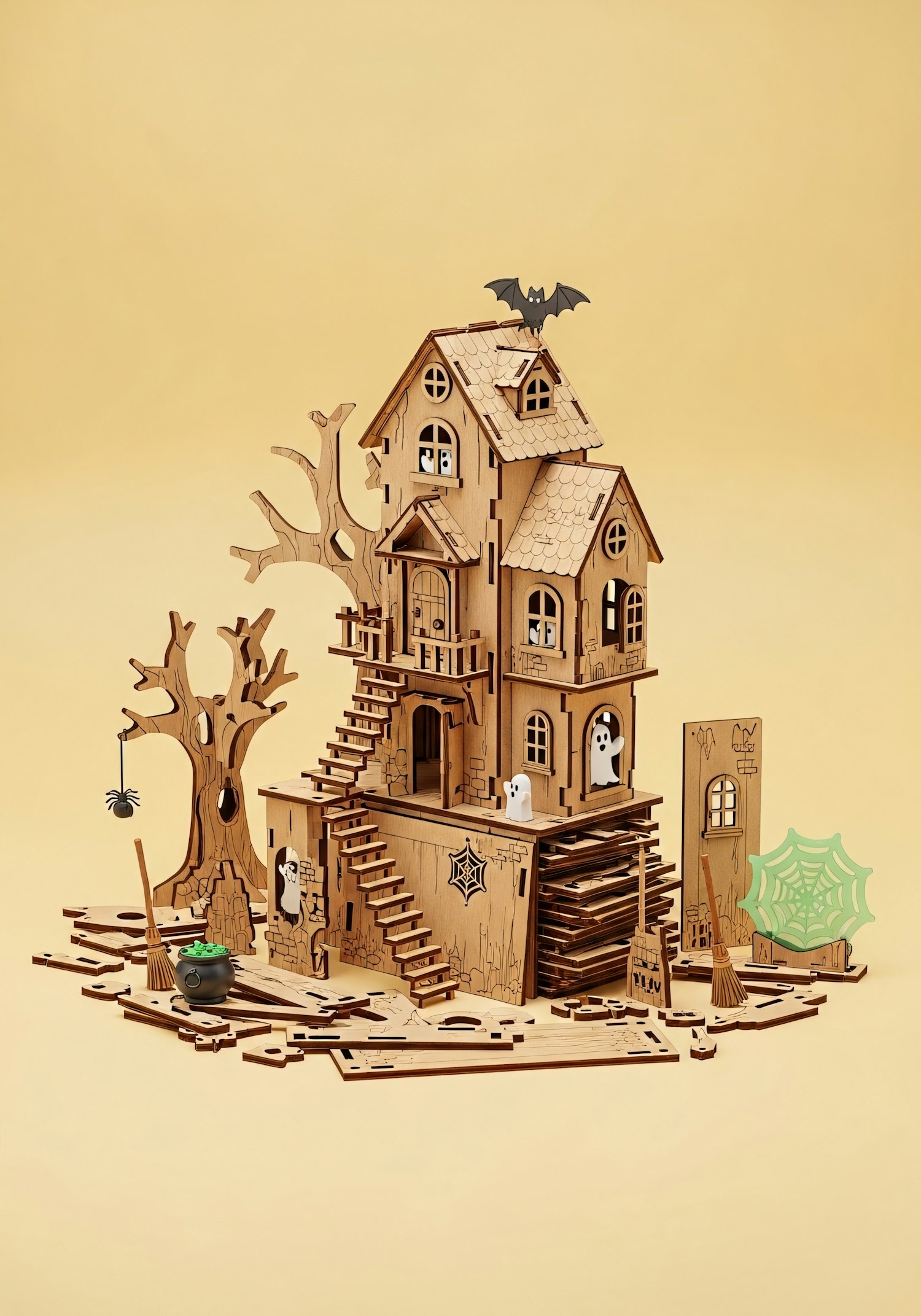 A detailed wooden haunted house model with ghosts, a bat, and spooky accessories, set against a plain yellow background.