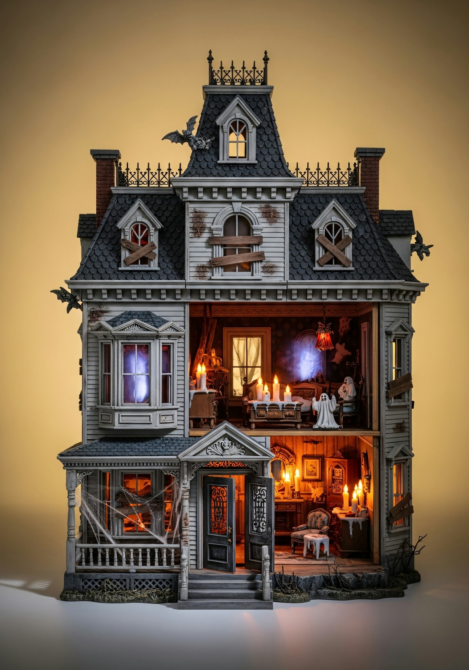 A detailed miniature haunted house with intricate interiors, eerie lighting, and spooky decorations, perfect for Halloween enthusiasts.